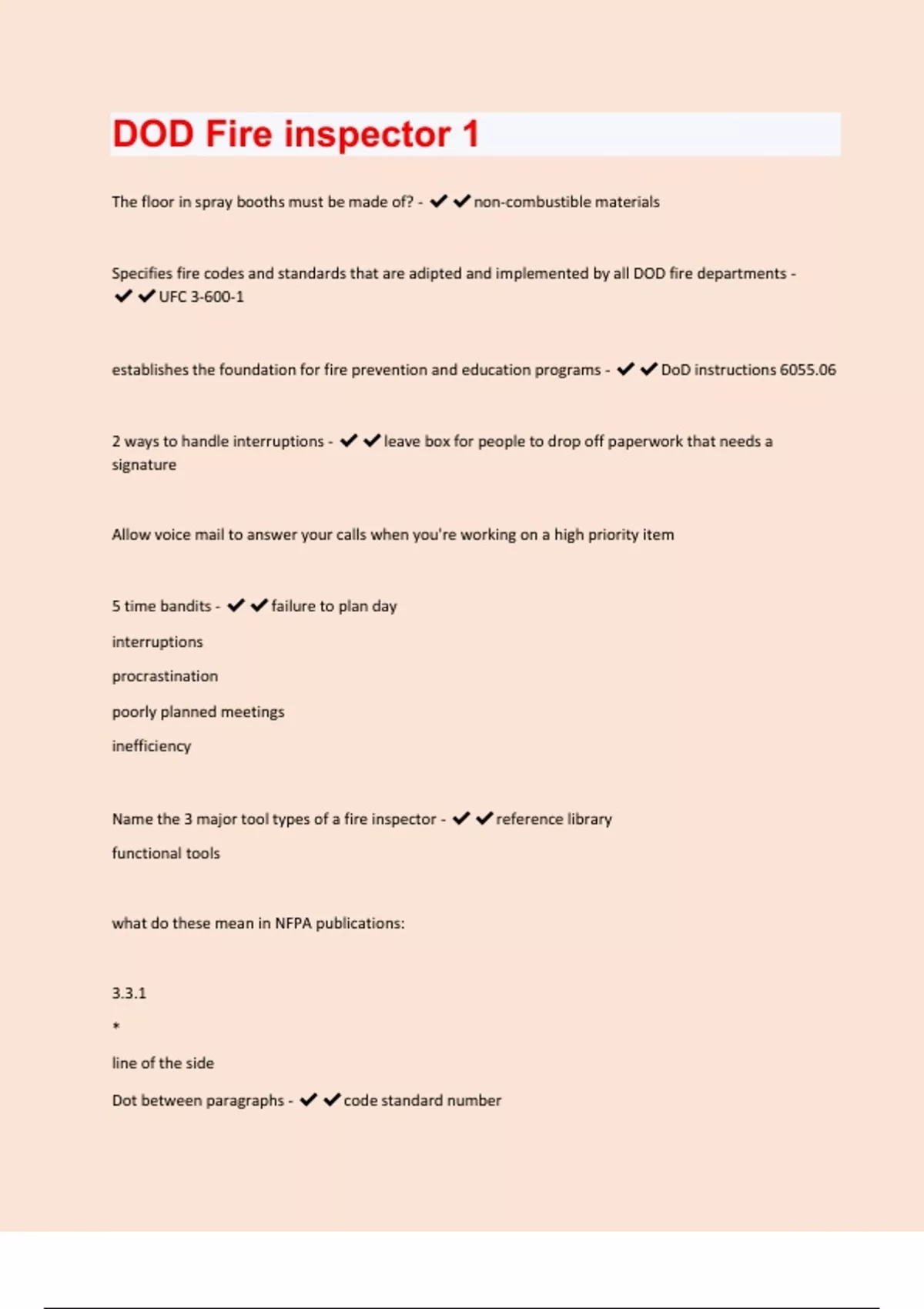 The floor in spray booths must be made of? - non-combustible materials Specifies fire codes and standards that are adipted and implemented by all DOD fire departments - UFC 3-600-1 establishes the foundation for fire prevention and education programs - DoD instructions 6055.06 2 ways to handle interruptions - leave box for people to drop off paperwork that needs a signature Allow voice mail to answer your calls when you're working on a high priority item 5 time bandits - failure to plan day interruptions procrastination poorly planned meetings inefficiency Name the 3 major tool types of a fire inspector - reference library functional tools what do these mean in NFPA publications: 3.3.1 * line of the side Dot between paragraphs - code standard number* explanatory material in appendix line- new changes dot - paragraph deleted provides minimum requirements to ensure a reasonable degree of safety to life form fire in building and structures. - NFPA 101 life safety handbook color-coded description of fire alarm systems and it includes recommendations for efficient compliance with the requirements of NFPA 72 - national fire alarm and signaling code handbook describes proper electrical systems and equipment installation for compliance with NFPA 70 national electrical code - national electric code handbook provides a comprehensive description of fire safety and systems. - fire protection handbook Describes fire hazards and provides recommendations for identifying and correcting problems. Also, provides checklist for inspections - NFPA insp