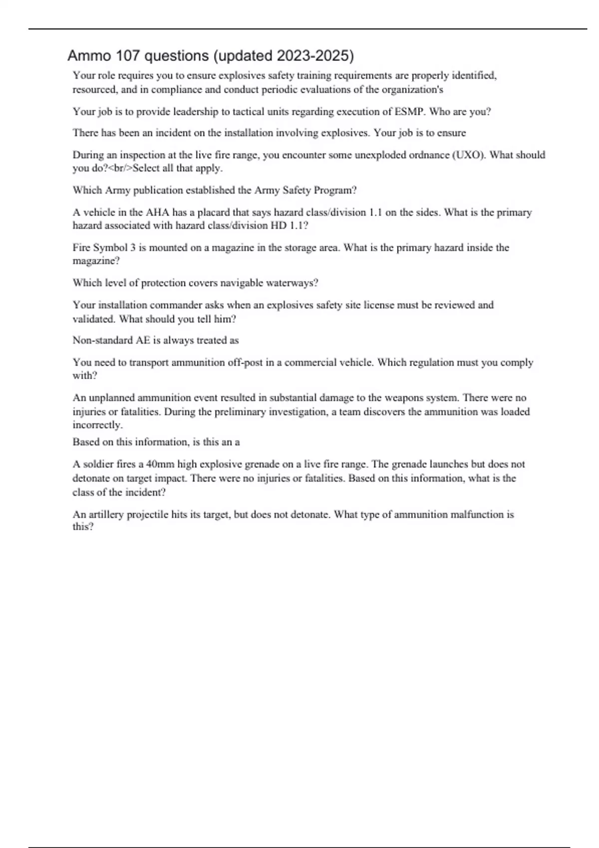 Ammo 107 questions (updated ) Your role requires you to ensure explosives safety training requirements are properly identified, resourced, and in compliance and conduct periodic evaluations of the organization's Your job is to provide leadership to tactical units regarding execution of ESMP. Who are you? There has been an incident on the installation involving explosives. Your job is to ensure During an inspection at the live fire range, you encounter some unexploded ordnance (UXO). What should you do?<br/>Select all that apply. Which Army publication established the Army Safety Program? A vehicle in the AHA has a placard that says hazard class/division 1.1 on the sides. What is the primary hazard associated with hazard class/division HD 1.1? Fire Symbol 3 is mounted on a magazine in the storage area. What is the primary hazard inside the magazine? Which level of protection covers navigable waterways? Your installation commander asks when an explosives safety site license must be reviewed and validated. What should you tell him? Non-standard AE is always treated as You need to transport ammunition off-post in a commercial vehicle. Which regulation must you comply with? An unplanned ammunition event resulted in substantial damage to the weapons system. There were no injuries or fatalities. During the preliminary investigation, a team discovers the ammunition was loaded incorrectly. Based on this information, is this an a A soldier fires a 40mm high explosive grenade on a live fire range. The grenade launches but does not detonate on target impact. There were no injuries or fatalities. Based on this information, what is the class of the incident? An artillery projectile hits its target, but does not detonate. What type of ammunition malfunction is this? You are asked to serve as first signer during an ammunition inspection at the ASP. What tasks are you expected to perform?<br/>Select all that apply. Based on its black color-coding and markings, in which category does this ammunition belong? Based on its color-coding and markings, in which category does this ammunition belong? Items considered HERO unreliable Items considered HERO susceptible There is an ammunition malfunction at the local range during an annual weapon qualification session. What does the ASP have to do? The installation commander wants to know how long you have to keep residue for a malfunction that resulted in personal injury or civilian property damage. What do you tell her? Operations needs to repair and remark open containers of AE. Where can they perform these maintenance tasks? The commander wants to know the basic storage rules for AE. Which of these do you tell him?<br/>Select all that apply. One method of preventing the accumulation of static electricity inside an operating area is the use of a You need to enter an ammunition operating area. Which of these control measures does NOT help reduce the static electricity risk you could create for AE? You are inspecting a row of magazines that contain Hazard Class 1.1 materials. Which symbol do you post on it? Controlled burns are an acceptable form of fire prevention. Which of these guidelines apply to managing a controlled burn?<br/>Select all that apply. The Safety Chief asks you to inspect several operating buildings on your installation. Which of these is a requirement for the exits in operating buildings? You have identified various hazards for a multi-service exercise at your installation and determined the associated risks. What do you need to do next as part of the risk management process? Your installation commander asked you to email her the goals of a Real Property Master Plan. Which of these statements should you NOT include in your email to her? Your role requires you to ensure explosives safety training requirements are properly identified, resourced, and in compliance and conduct periodic evaluations of the organization's ESP. Who are you? Your job is to provide leadership to tactical units regarding execution of ESMP. Who are you? There has been an incident on the installation involving explosives. Your job is to ensure During an inspection at the live fire range, you encounter some unexploded ordnance (UXO). What should you do?<br/>Select all that apply.