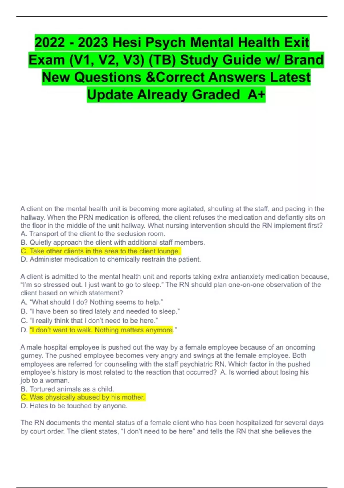 Hesi Psych Mental Health Exit Exam (V1, V2, V3) (TB) Study Guide Brand New Questions &Correct Answers Latest Update Already Graded A+