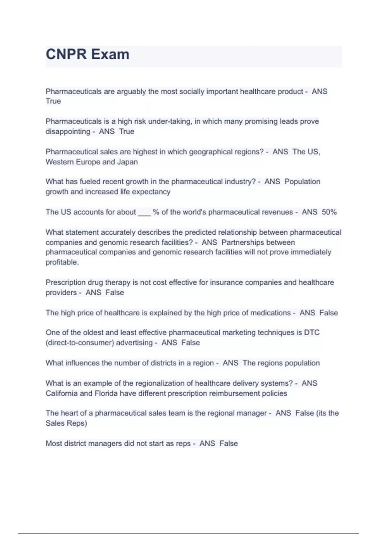 CNPR Exam Prep Questions With Answers Pharmaceuticals are arguably the most socially important healthcare product - ANS True Pharmaceuticals is a high risk under-taking, in which many promising leads prove disappointing - ANS True Pharmaceutical sales are highest in which geographical regions? - ANS The US, Western Europe and Japan What has fueled recent growth in the pharmaceutical industry? - ANS Population growth and increased life expectancy The US accounts for about ___ % of the world's pharmaceutical revenues - ANS 50% What statement accurately describes the predicted relationship between pharmaceutical companies and genomic research facilities? - ANS Partnerships between pharmaceutical companies and genomic research facilities will not prove immediately profitable. Prescription drug therapy is not cost effective for insurance companies and healthcare providers - ANS False The high price of healthcare is explained by the high price of medications - ANS False One of the oldest and least effective pharmaceutical marketing techniques is DTC (direct-to-consumer) advertising - ANS False What influences the number of districts in a region - ANS The regions population What is an example of the regionalization of healthcare delivery systems? - ANS California and Florida have different prescription reimbursement policies The heart of a pharmaceutical sales team is the regional manager - ANS False (its the Sales Reps) Most district managers did not start as reps - ANS False