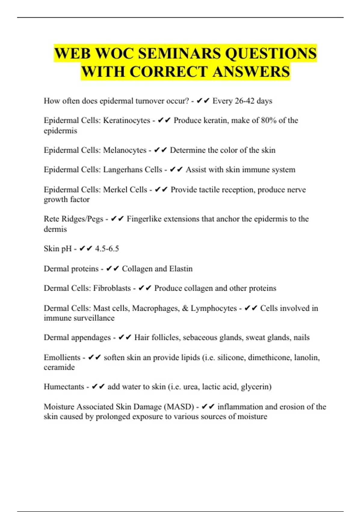 How often does epidermal turnover occur? - Every 26-42 days Epidermal Cells: Keratinocytes - Produce keratin, make of 80% of the epidermis Epidermal Cells: Melanocytes - Determine the color of the skin Epidermal Cells: Langerhans Cells - Assist with skin immune system Epidermal Cells: Merkel Cells - Provide tactile reception, produce nerve growth factor Rete Ridges/Pegs - Fingerlike extensions that anchor the epidermis to the dermis Skin pH - 4.5-6.5 Dermal proteins - Collagen and Elastin Dermal Cells: Fibroblasts - Produce collagen and other proteins Dermal Cells: Mast cells, Macrophages, & Lymphocytes - Cells involved in immune surveillance Dermal appendages - Hair follicles, sebaceous glands, sweat glands, nails Emollients - soften skin an provide lipids (i.e. silicone, dimethicone, lanolin, ceramide Humectants - add water to skin (i.e. urea, lactic acid, glycerin) Moisture Associated Skin Damage (MASD) - inflammation and erosion of the skin caused by prolonged exposure to various sources of moisture Intertriginous Dermatitis (ITD) - a type of MASD, inflammation and skin erosion involving body folds and friction of skin to skin Peristomal MASD (PMASD) - Inflammation and denudation of the peristomal skin associated with effluent exposure such as urine or stool Periwound MASD (PWMASD) - inflammation and erosion of the skin around a chronic wound associated with sustained contact of wound exudate Incontinence Associated Dermatitis (IAD) - a type of MASD, inflammation caused by the prolonged exposure to urine, feces, or dual incontinence Medical Adhesive-Related Skin Injury (MARSI) - erythema (or other manifestation) of cutaneous abnormality that persists 30 minutes of more after removal of adhesive dressing or tape, types: maceration, mechanical trauma (i.e. skin tear), tension blister, folliculitis What is the key indicator of undernutrition? - unintended weight loss, 5% loss in body weight in 1 month or 10% loss in body weight in 6 months WOC nursing products & services - direct assessment and management, planning, education, cost reduction, risk reduction Iron function - hemoglobin formation, oxygen transport, collagen formation Iron sources - liver, lean meat, poultry, oysters, dried beans, fortified cereals Zinc function - cofactor for collagen synthesis Zinc sources - Seafood, meat, liver, milk, eggs, wheat germ, whole wheat bread Copper function - essential for cross-linking of collagen, assists in RBC formation Copper sources - nuts, dried fruit and beans, whole grain cereal, organ meats