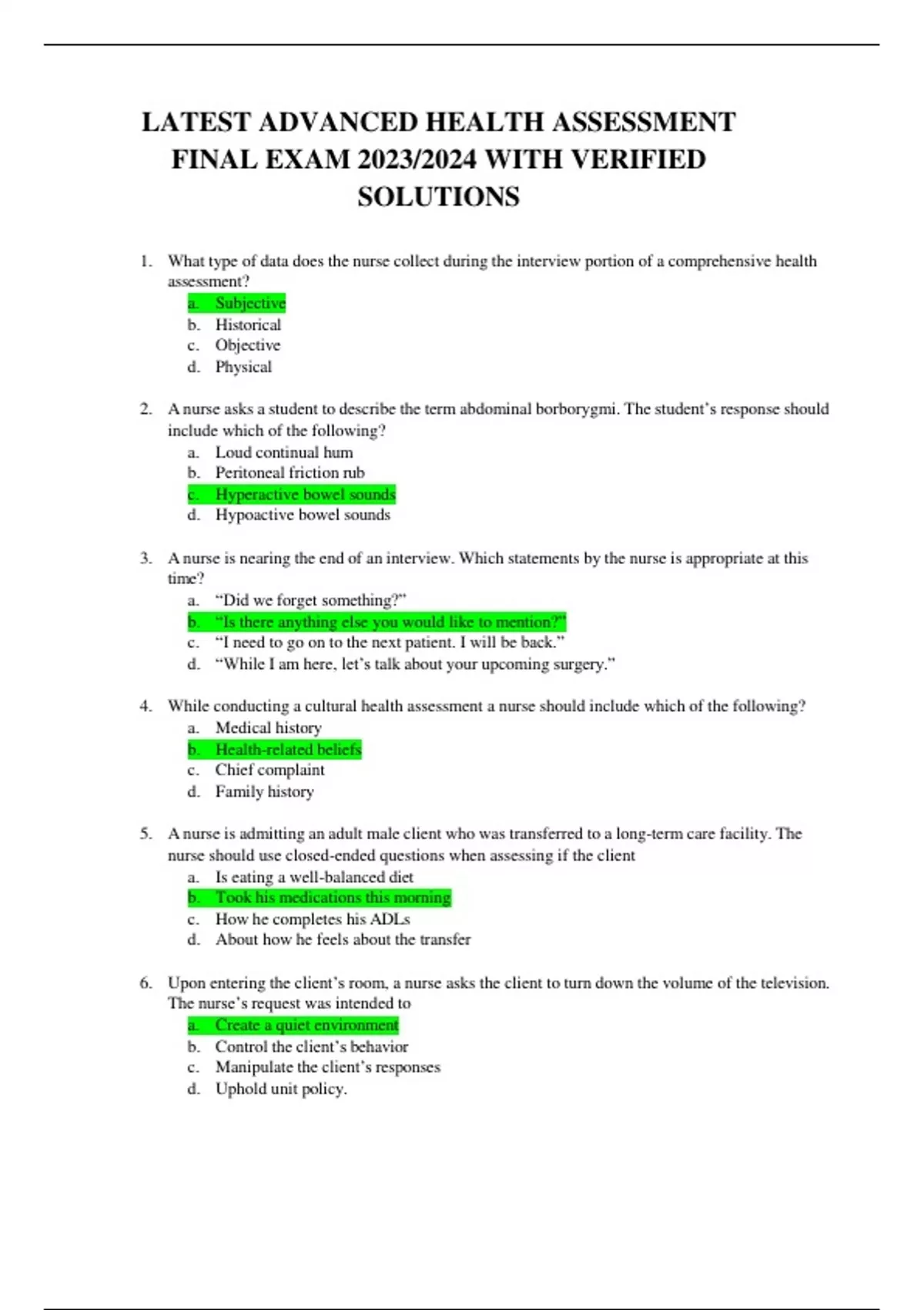 LATEST ADVANCED HEALTH ASSESSMENT FINAL EXAM 2023/2024 WITH VERIFIED SOLUTIONS