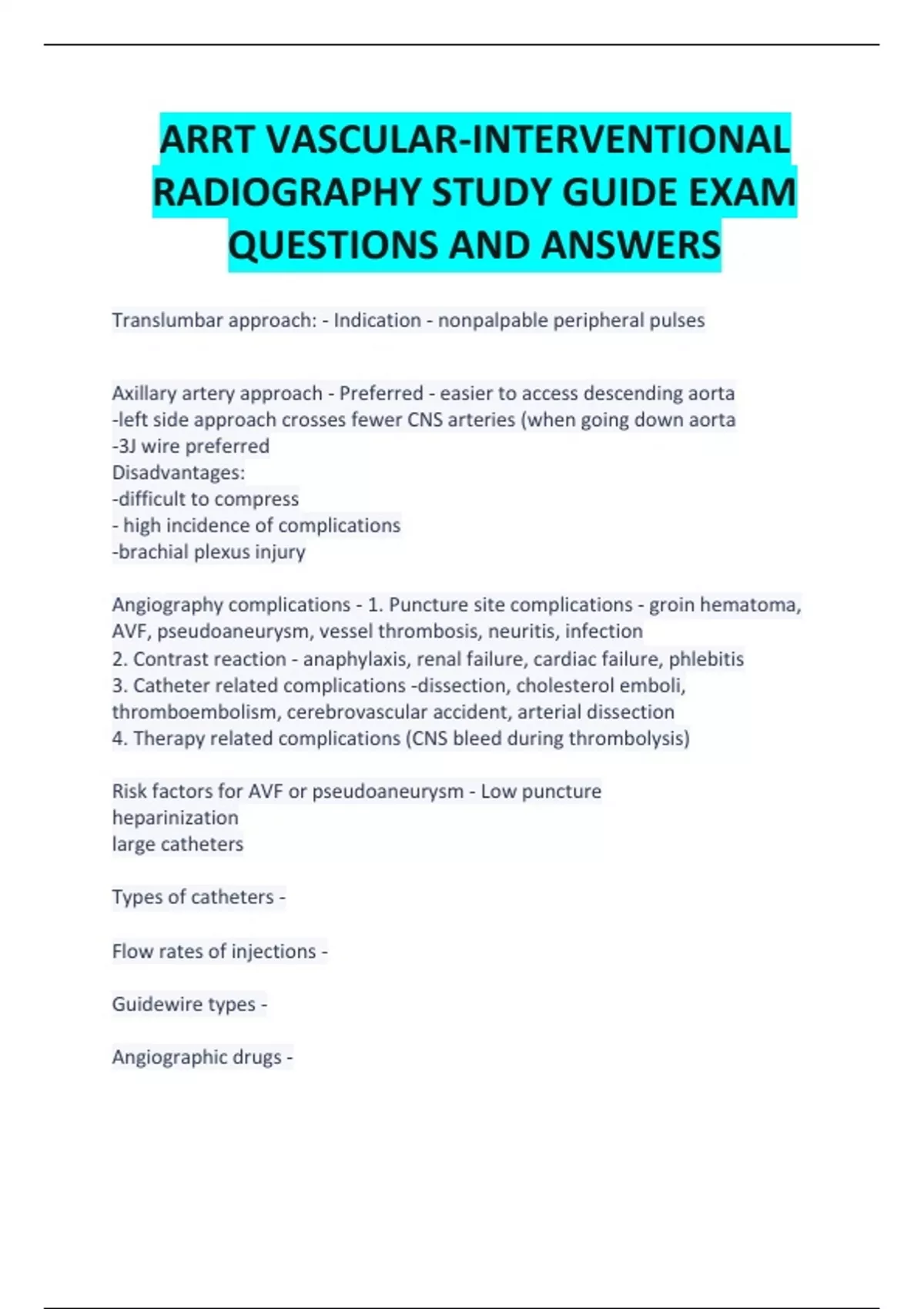 ARRT VASCULAR-INTERVENTIONAL RADIOGRAPHY STUDY GUIDE EXAM QUESTIONS AND ANSWERS