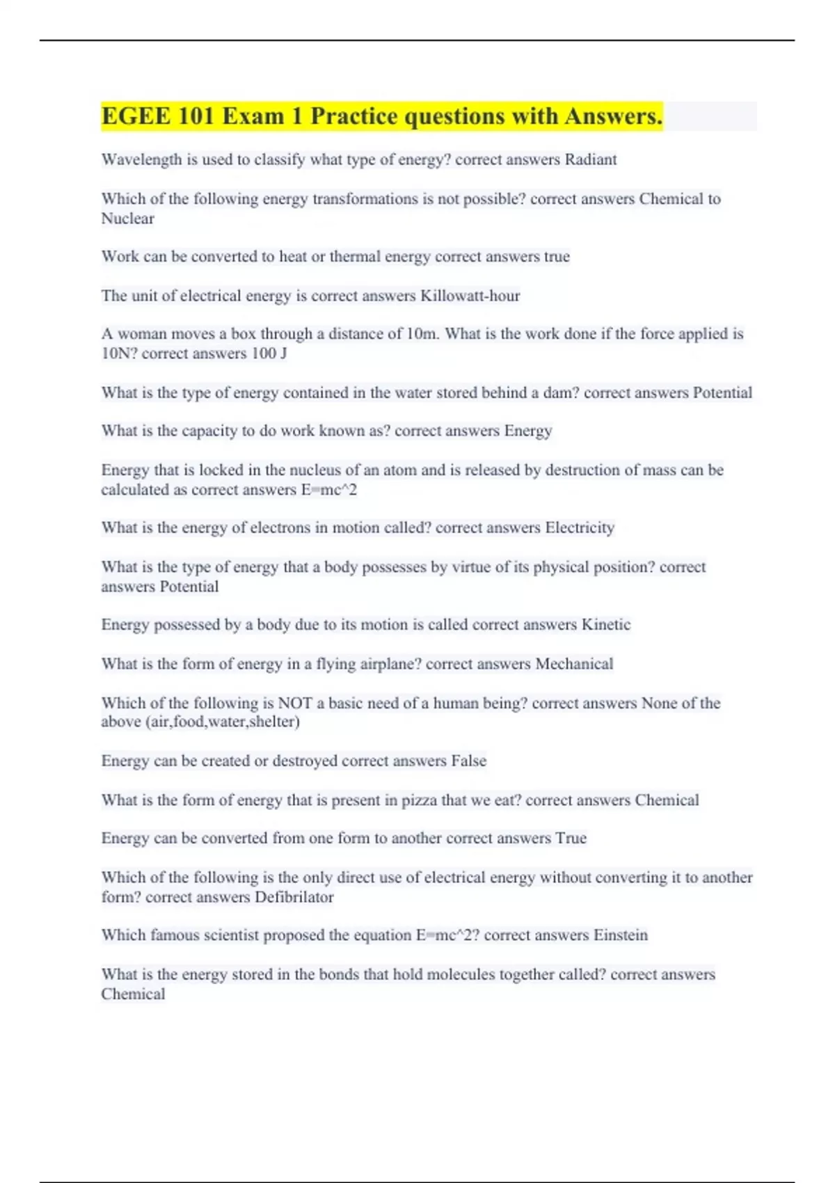 Wavelength is used to classify what type of energy? correct answers Radiant Which of the following energy transformations is not possible? correct answers Chemical to Nuclear Work can be converted to heat or thermal energy correct answers true The unit of electrical energy is correct answers Killowatt-hour A woman moves a box through a distance of 10m. What is the work done if the force applied is 10N? correct answers 100 J What is the type of energy contained in the water stored behind a dam? correct answers Potential What is the capacity to do work known as? correct answers Energy Energy that is locked in the nucleus of an atom and is released by destruction of mass can be calculated as correct answers E=mc^2 What is the energy of electrons in motion called? correct answers Electricity What is the type of energy that a body possesses by virtue of its physical position? correct answers Potential Energy possessed by a body due to its motion is called correct answers Kinetic What is the form of energy in a flying airplane? correct answers Mechanical Which of the following is NOT a basic need of a human being? correct answers None of the above (air,food,water,shelter) Energy can be created or destroyed correct answers False What is the form of energy that is present in pizza that we eat? correct answers Chemical Energy can be converted from one form to another correct answers True Which of the following is the only direct use of electrical energy without converting it to another form? correct answers Defibrilator Which famous scientist proposed the equation E=mc^2? correct answers Einstein What is the energy stored in the bonds that hold molecules together called? correct answers Chemical