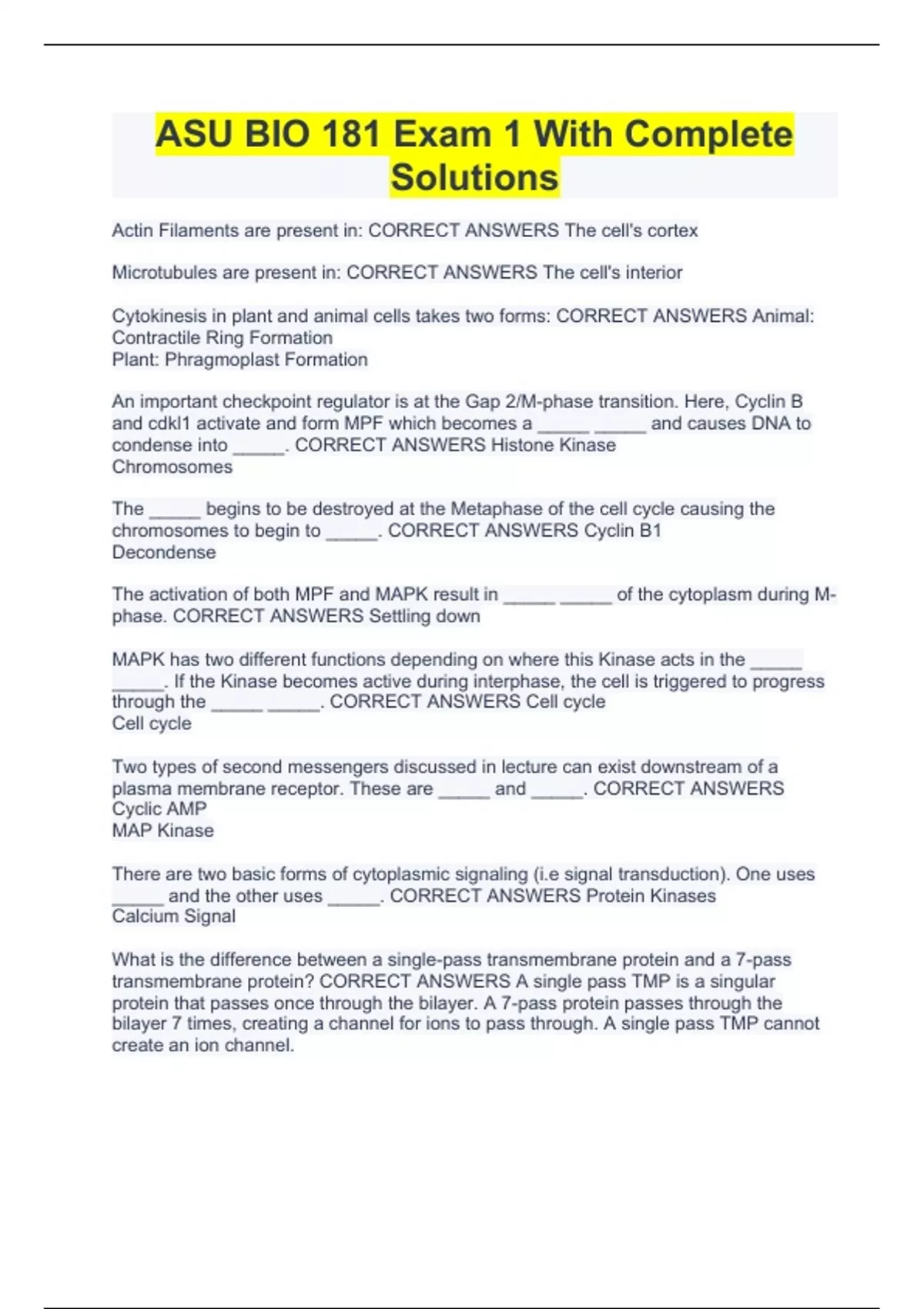 asu bio 181 exam 1 with complete solutions