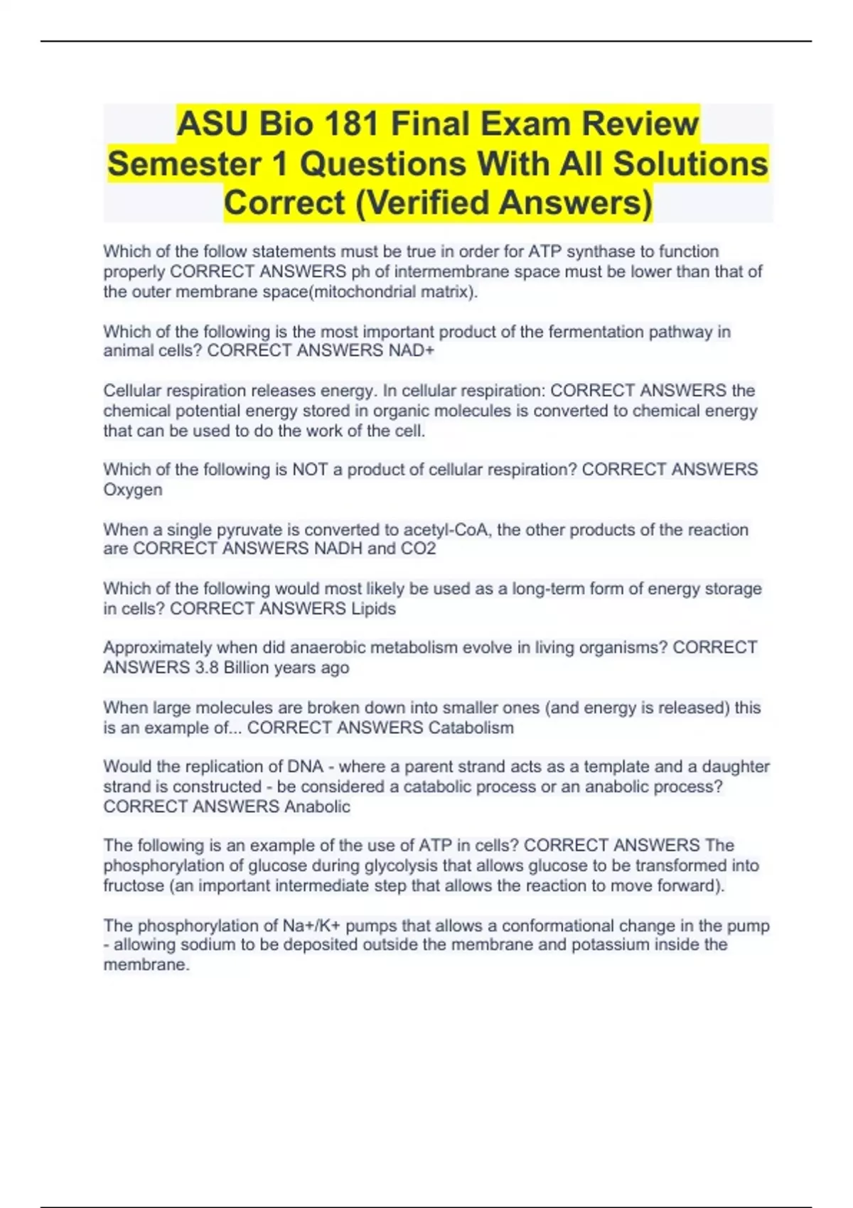 ASU Bio 181 Final Exam Review Semester 1 Questions With All Solutions Correct (Verified Answers)