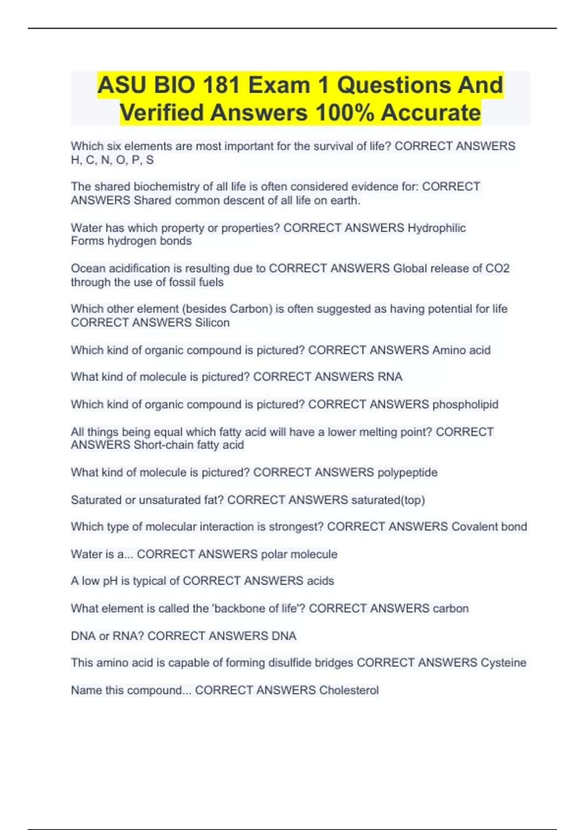 asu bio 181 exam 1 questions and verified answers