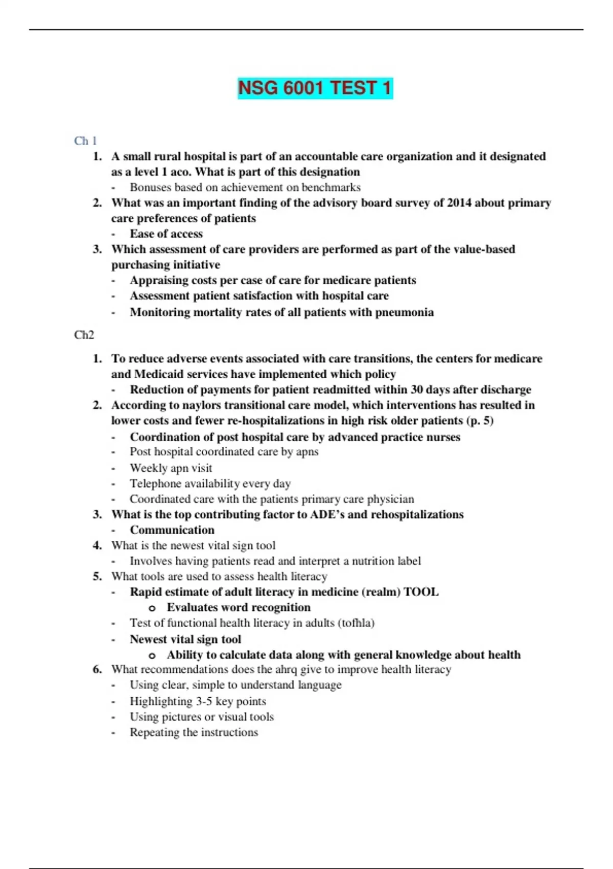 NSG 6001 TEST 1 - QUESTIONS AND ANSWERS A small rural hospital is part of an accountable care organization and it designated as a level 1 aco. What is part of this designation - Bonuses based on achievement on benchmarks 2. What was an important finding of the advisory board survey of 2014 about primary care preferences of patients - Ease of access 3. Which assessment of care providers are performed as part of the value-based purchasing initiative - Appraising costs per case of care for medicare patients - Assessment patient satisfaction with hospital care - Monitoring mortality rates of all patients with pneumonia Ch2 1. To reduce adverse events associated with care transitions, the centers for medicare and Medicaid services have implemented which policy - Reduction of payments for patient readmitted within 30 days after discharge 2. According to naylors transitional care model, which interventions has resulted in lower costs and fewer re-hospitalizations in high risk older patients (p. 5) - Coordination of post hospital care by advanced practice nurses