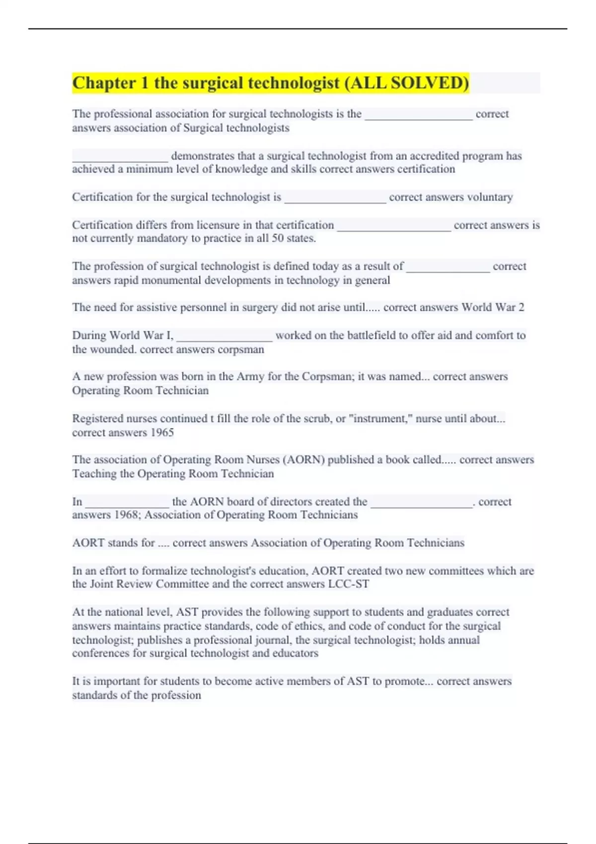The professional association for surgical technologists is the __________________ correct answers association of Surgical technologists ________________ demonstrates that a surgical technologist from an accredited program has achieved a minimum level of knowledge and skills correct answers certification Certification for the surgical technologist is _________________ correct answers voluntary Certification differs from licensure in that certification ___________________ correct answers is not currently mandatory to practice in all 50 states. The profession of surgical technologist is defined today as a result of ______________ correct answers rapid monumental developments in technology in general The need for assistive personnel in surgery did not arise until..... correct answers World War 2 During World War I, ________________ worked on the battlefield to offer aid and comfort to the wounded. correct answers corpsman A new profession was born in the Army for the Corpsman; it was named... correct answers Operating Room Technician Registered nurses continued t fill the role of the scrub, or "instrument," nurse until about... correct answers 1965 The association of Operating Room Nurses (AORN) published a book called..... correct answers Teaching the Operating Room Technician In ______________ the AORN board of directors created the _________________. correct answers 1968; Association of Operating Room Technicians AORT stands for .... correct answers Association of Operating Room Technicians In an effort to formalize technologist's education, AORT created two new committees which are the Joint Review Committee and the correct answers LCC-ST At the national level, AST provides the following support to students and graduates correct answers maintains practice standards, code of ethics, and code of conduct for the surgical technologist; publishes a professional journal, the surgical technologist; holds annual conferences for surgical technologist and educators It is important for students to become active members of AST to promote... correct answers standards of the profession