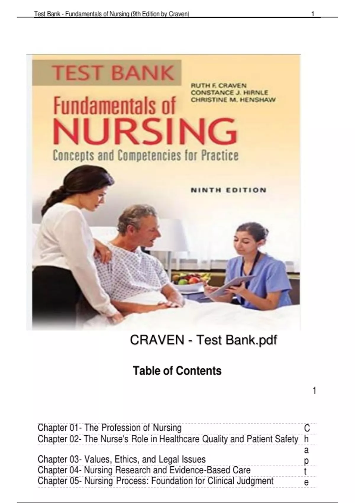 TEST BANK OF FAUDATION OF NURSING CONCEPT AND COMPITENCIES FOR PRACTIES. 2. The nurse is caring for a diabetic patient who expresses the desire to learn more about a diabetic diet in an attempt to gain better control of his blood sugar. The nurses actions will be based on which non-nursing theory? A) Change theory B) Maslows hierarchy of human needs C) NeumAns systems model D) Watsons theory of caring Ans : A Feedback: The patient has identified a need for change, which will guide the nurses actions. Maslows hierarchy of human needs helps nurses prioritize actions. Neuman and Watson are nursing theorists. 3. The Quality and Safety Education for Nurses Initiative (QSEN) has identified which key competencies for nurses? Select all that apply. A) Patient-centered care B) Teamwork and collaboration C) Evidence-based practice D) Quality improvement E) Correct documentation Ans : A, B, C, D Feedback: The QSEN has identified patient-centered care, teamwork and collaboration, evidence-based practice, and quality improvement as a meAns for nurses to improve the quality and safety of patient care wherever they work. Additional key competencies identified are safety and informatics. 4. The nurse is caring for a patient who is on a ventilator. The nurse is bathing the patient and talking to them as she is carrying out care, as well as telling the patient what is going to happen next. The nurse speaks to the patient in a soothing manner. The nurse is acting in which role? (Select all that apply) A) Caregiver B) Decision-maker C) Communicator D) Educator E) Patient advocate Ans : A, C, D Feedback: The nurse is fulfilling the role of caregiver by providing the care and speaking to the patient in a soothing manner. The nurse is also acting as a communicator talking to the patient even if the patient cant respond. The nurse is also acting as an educator by informing the patient of the care that will be performed. The nurse is not assisting in making any decisions or speaking on behalf of the patient. 5. The nurse offers a patient two possible times to ambulate as the physician has ordered. The nurse is acting in which nursing role? A) Communicator B) Patient advocate C) Manager and coordinator