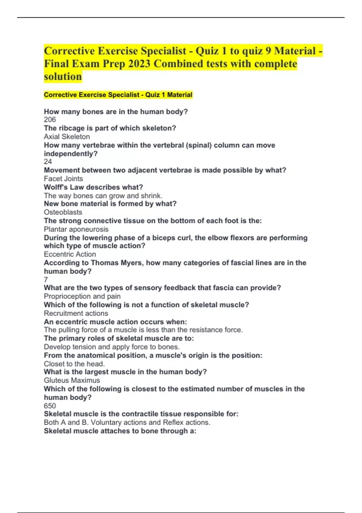 Corrective Exercise Specialist - Quiz 1 to quiz 9 Material - Final Exam Prep 2023 Combined tests with complete solution Corrective Exercise Specialist - Quiz 1 Material How many bones are in the human body? 206 The ribcage is part of which skeleton? Axial Skeleton How many vertebrae within the vertebral (spinal) column can move independently? 24 Movement between two adjacent vertebrae is made possible by what? Facet Joints Wolff's Law describes what? The way bones can grow and shrink. New bone material is formed by what? Osteoblasts The strong connective tissue on the bottom of each foot is the: Plantar aponeurosis During the lowering phase of a biceps curl, the elbow flexors are performing which type of muscle action? Eccentric Action According to Thomas Myers, how many categories of fascial lines are in the human body? 7 What are the two types of sensory feedback that fascia can provide? Proprioception and pain Which of the following is not a function of skeletal muscle? Recruitment actions An eccentric muscle action occurs when: The pulling force of a muscle is less than the resistance force. The primary roles of skeletal muscle are to: Develop tension and apply force to bones. From the anatomical position, a muscle's origin is the position: Closet to the head. What is the largest muscle in the human body? Gluteus Maximus Which of the following is closest to the estimated number of muscles in the human body? 650 Skeletal muscle is the contractile tissue responsible for: Both A and B. Voluntary actions and Reflex actions. Skeletal muscle attaches to bone through a: