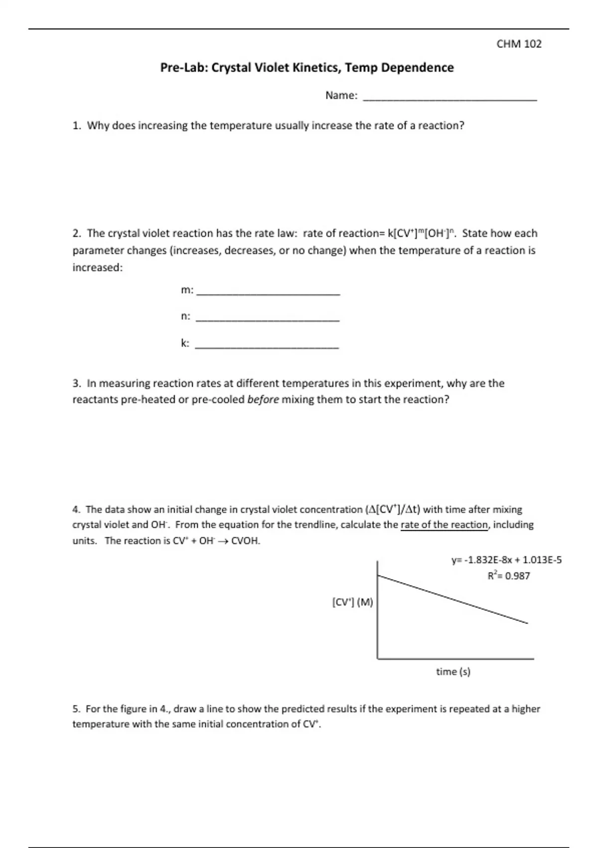 This is a pre-lab assignment that contains calculations of how to calculate the rate of reaction and the concentration.
