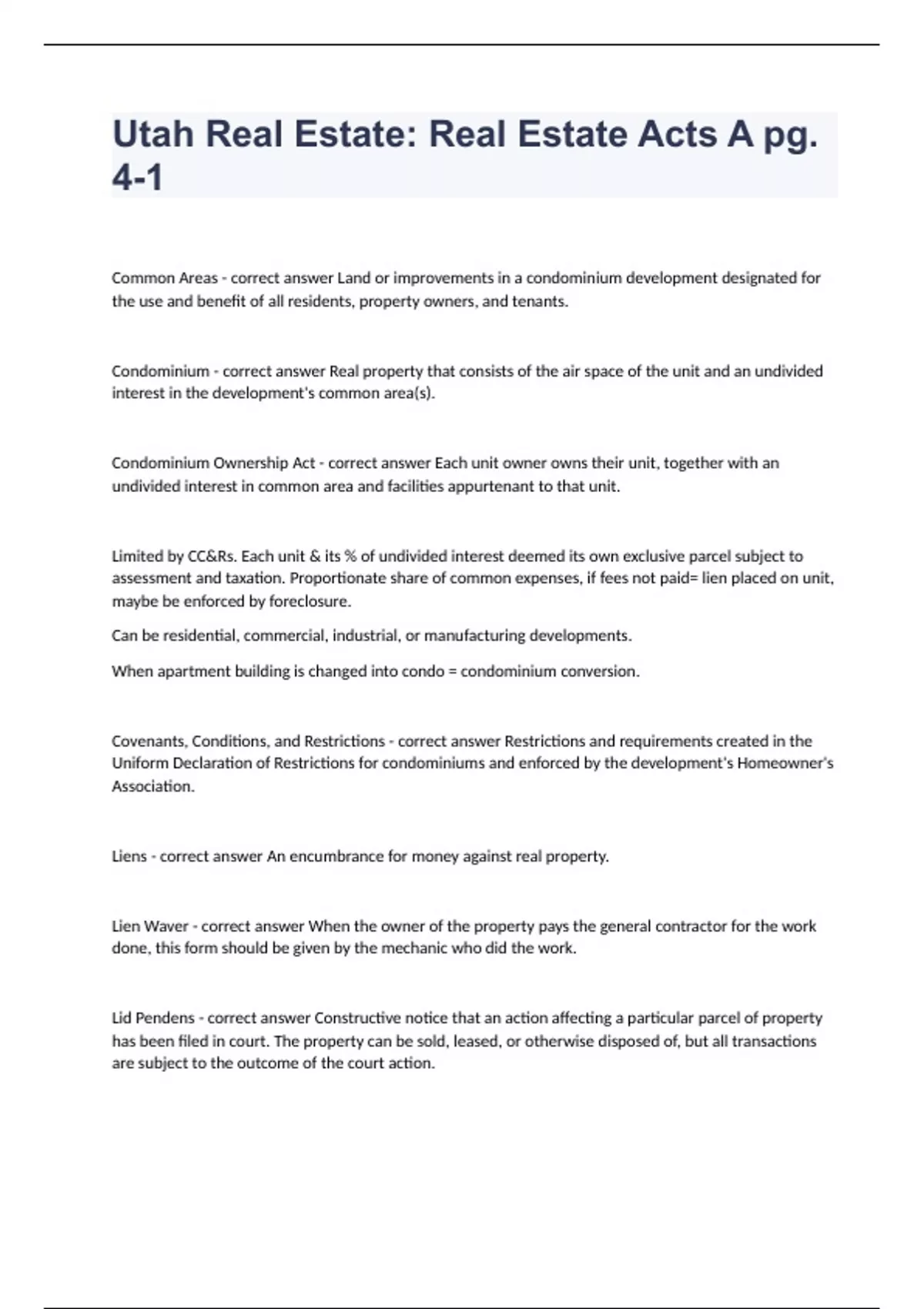 Utah Real Estate Real Estate Acts A pg. 4-1Common Areas Land or improvements in a condominium development designated for the use and benefit of all residents, property owners, and tenants. Condominium Real property that consists of the air space of the unit and an undivided interest in the development's common area(s). Condominium Ownership Act Each unit owner owns their unit, together with an undivided interest in common area and facilities appurtenant to that unit. Limited by CC&Rs. Each unit & its % of undivided interest deemed its own exclusive parcel subject to assessment and taxation. Proportionate share of common expenses, if fees not paid= lien placed on unit, maybe be enforced by foreclosure. Can be residential, commercial, industrial, or manufacturing developments. When apartment building is changed into condo = condominium conversion. Covenants, Conditions, and Restrictions Restrictions and requirements created in the Uniform Declaration of Restrictions for condominiums and enforced by the development's Homeowner's Association. Liens An encumbrance for money against real property. Lien Waver When the owner of the property pays the general contractor for the work done, this form should be given by the mechanic who did the work. Lid Pendens Constructive notice that an action affecting a particular parcel of property has been filed in court. The property can be sold, leased, or otherwise disposed of, but all transactions are subject to the outcome of the court action. Market Record Title Act Claims to Rights/interest in land have been inactive for longer that statutory period (40 yrs in Utah) are cut off. Purpose is to simply and stabilize title searches and the transfer of real property by removing old encumbrances from the title. Doesn't extend time period for brining action as given under statute of limitations. Exemptions: water rights, mineral rights, right Title or interest of state political subdivision of state, right Title interest of US by reason of failure to file notice, easement that can be verified by physical evidence of use, easements for pipelines highways railroads or public utilities, bar a lessor taking possession after expiration of a lease. Mechanic's Lien A lien placed by a person who has integrated labor or materials into a property and has not been paid. Planned Unit Development (PUD) A non traditional type of housing development designed to produce high density of dwellings, maximum use of open spaces, and greater flexibility for residential land and development. Local government approval is required for this development. Release of Lien I'd a mechanic had previously placed a claim against the property where the work was done, when payment is made, this for must be filled within ten days. Stock Cooperative or Co-Ops A lease in a unit of property derived from the ownership of stock in a company. Also called a proprietary or owner's lease. Subdivision Land divided into lots which may or may not include improvements. Timeshare and Camp Resort Act Administered by the Real Estate Division and similar to the Utah Uniform Land Sales Practices Act. Timeshare interest-right to occupy fixed/variable accommodations during 3+ separate times over period of 3 yrs. Timeshare estate- small undivided fraction fee interest in real property, purchaser doesn't receive right to use except as provided by contract. Camp resort- enterprise that has as its primary purpose the offering of a camp resort interest. Camp resort interest- right to use/occupy a camp site. Camping site- a space designated for purpose of locating a trailer, tent, or land based portable housing. A person hired to sell any of these does NOT need a real estate license, but must be registered with the Real Estate Division. Utah Exemption Act (Homestead) Protects portion of homeowners equity monies in event of forced forfeiture of residence through sale of the home or through bankruptcy. Equity is shielded from certain types of creditors whose claim might be exercised through a judgment lien. -protects from certain debts: medical bills, business debts, unsecured damage liens -not protected for: statutory liens for taxes/assessments, security interests in prop. Judicial liens for debt created for purchase of prop, judicial liens obtained for failure to provide support/maintenance for dependent children, consensual liens obtained for debt created by mutual contract. Head of household: $30,000 Spouse: $30,000 = $60,000 max exemption. Filing requirements: "Declaration of Homestead." When house sells- exemption proceeds protected for 1 year. Utah Uniform Land Sales Practice Administered by Real Estate Division. Subdividers could be subject to disciplinary actions if they don't register through the Division. Subdivision must be registered under this act, subdivider must comply with all requirements for disclosure in marketing to public. Person hired to sell land in a subdivision must have real estate license.