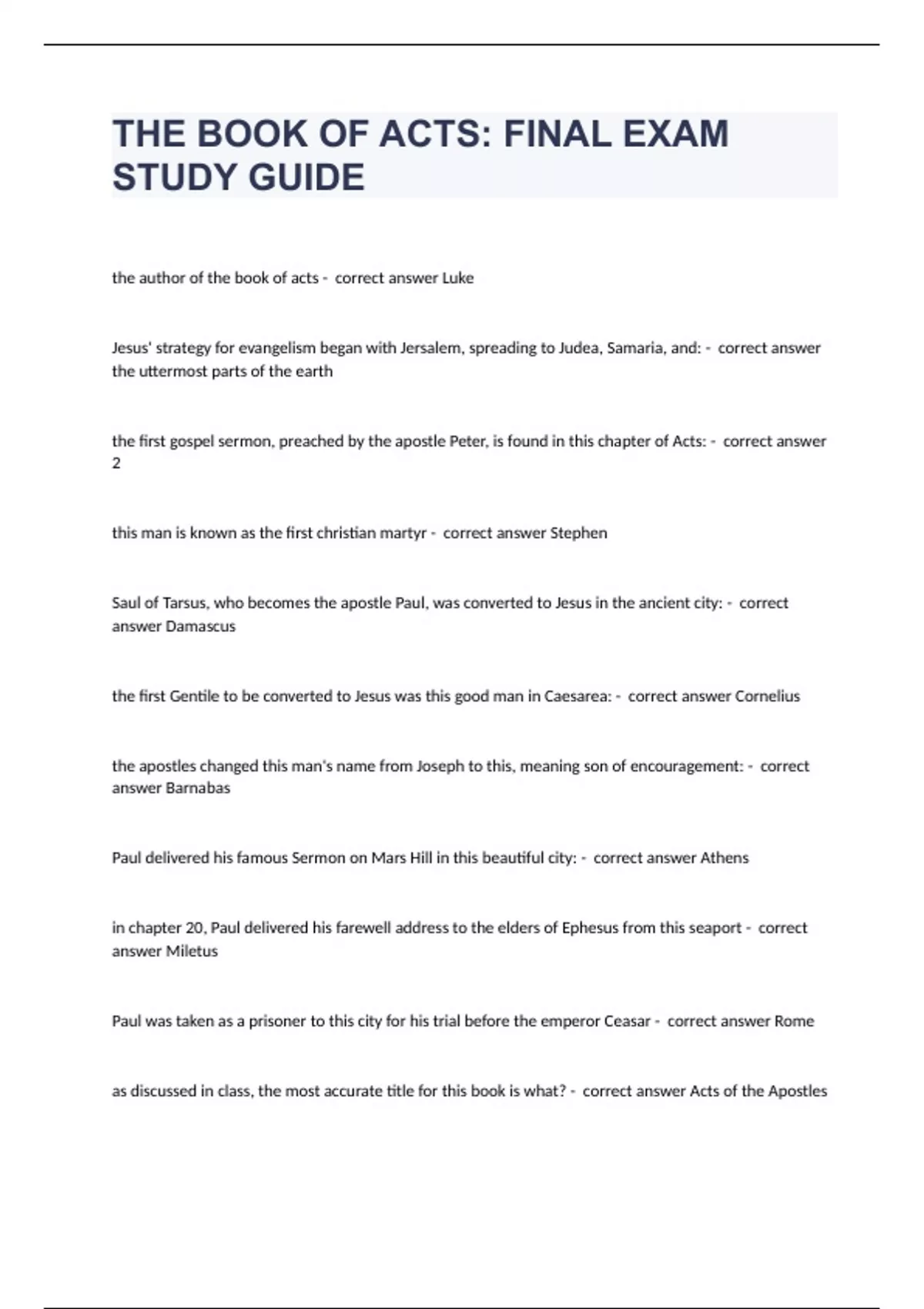 THE BOOK OF ACTS FINAL EXAM STUDY GUIDEthe author of the book of acts Luke Jesus' strategy for evangelism began with Jersalem, spreading to Judea, Samaria, and: the uttermost parts of the earth the first gospel sermon, preached by the apostle Peter, is found in this chapter of Acts: 2 this man is known as the first christian martyr Stephen Saul of Tarsus, who becomes the apostle Paul, was converted to Jesus in the ancient city: Damascus the first Gentile to be converted to Jesus was this good man in Caesarea: Cornelius the apostles changed this man's name from Joseph to this, meaning son of encouragement: Barnabas Paul delivered his famous Sermon on Mars Hill in this beautiful city: Athens in chapter 20, Paul delivered his farewell address to the elders of Ephesus from this seaport Miletus Paul was taken as a prisoner to this city for his trial before the emperor Ceasar Rome as discussed in class, the most accurate title for this book is what? Acts of the Apostles the writer of the book of Acts was a Jew or a non-Jew? NON-Jew who wrote the book of Acts? Luke