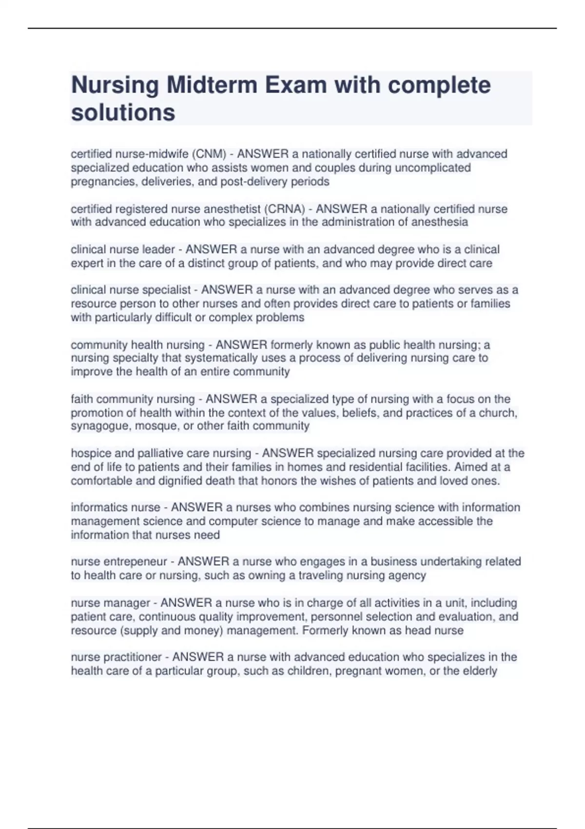 Nursing Midterm Exam with complete solutions