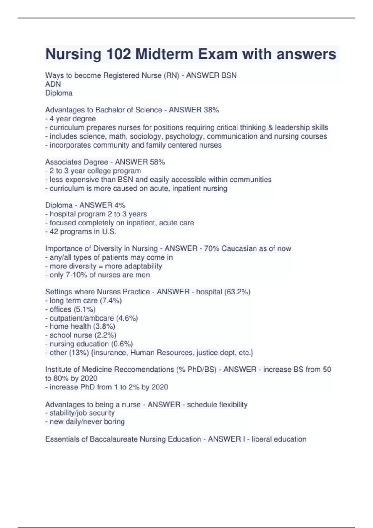 Nursing 102 Midterm Exam with answers