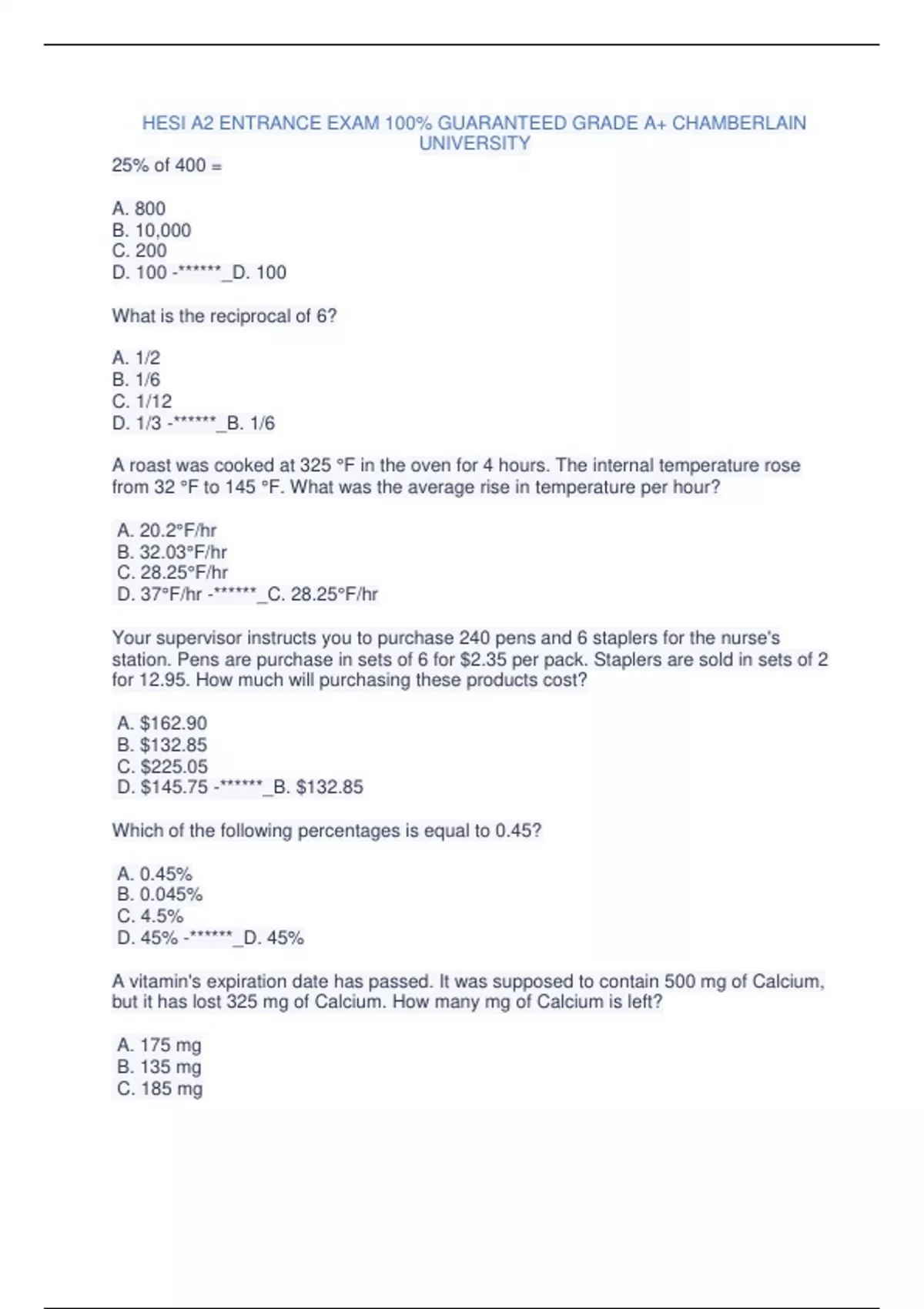 MATHS HESI ENTRANCE EXAM HESI A2 EXAM QUESTIONS AND ANSWERS GRADE A+