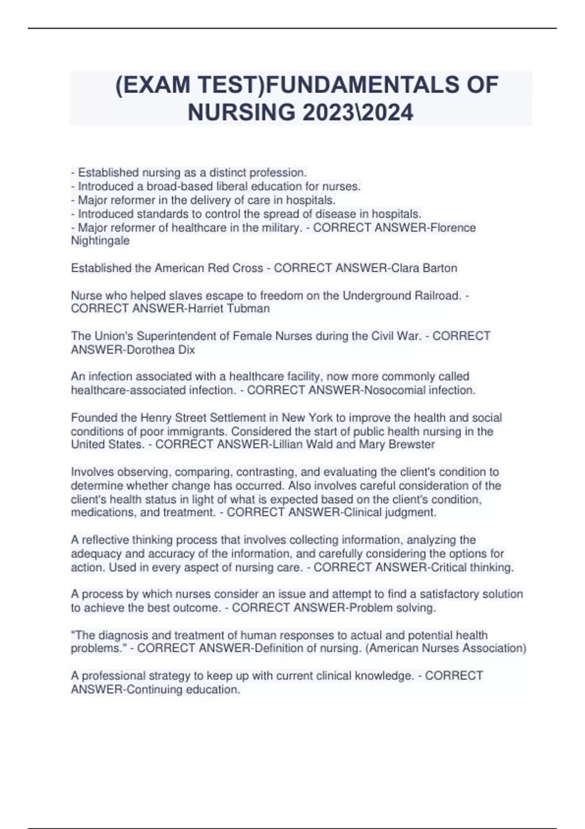 (EXAM TEST)FUNDAMENTALS OF NURSING - Established nursing as a distinct profession. - Introduced a broad-based liberal education for nurses. - Major reformer in the delivery of care in hospitals. - Introduced standards to control the spread of disease in hospitals. - Major reformer of healthcare in the military. - CORRECT ANSWER-Florence Nightingale Established the American Red Cross - CORRECT ANSWER-Clara Barton Nurse who helped slaves escape to freedom on the Underground Railroad. - CORRECT ANSWER-Harriet Tubman The Union's Superintendent of Female Nurses during the Civil War. - CORRECT ANSWER-Dorothea Dix An infection associated with a healthcare facility, now more commonly called healthcare-associated infection. - CORRECT ANSWER-Nosocomial infection. Founded the Henry Street Settlement in New York to improve the health and social conditions of poor immigrants. Considered the start of public health nursing in the United States. - CORRECT ANSWER-Lillian Wald and Mary Brewster Involves observing, comparing, contrasting, and evaluating the client's condition to determine whether change has occurred. Also involves careful consideration of the client's health status in light of what is expected based on the client's condition, medications, and treatment. - CORRECT ANSWER-Clinical judgment. A reflective thinking process that involves collecting information, analyzing the adequacy and accuracy of the information, and carefully considering the options for action. Used in every aspect of nursing care. - CORRECT ANSWER-Critical thinking. A process by which nurses consider an issue and attempt to find a satisfactory solution to achieve the best outcome. - CORRECT ANSWER-Problem solving. "The diagnosis and treatment of human responses to actual and potential health problems." - CORRECT ANSWER-Definition of nursing. (American Nurses Association) A professional strategy to keep up with current clinical knowledge. - CORRECT ANSWER-Continuing education. The informal education that occurs as you move into your new profession. It is knowledge gained from direct experience, observation in the real world, and informal discussion with peers and colleagues. - CORRECT ANSWER-Socialization. This model shows that expertise is not merely a demonstration of skilled application of knowledge, but rather a personal integration of knowledge that requires technical skill, thoughtful application, and insight. Full-spectrum nursing. - CORRECT ANSWERBenner's Model (Patricia Benner, 1984) This phase of Benner's Model begins with the onset of education. "Learning the rules". - CORRECT ANSWER-Stage 1: Novice What are the stages of Brenner's Model? - CORRECT ANSWER-Stage 1: Novice Stage 2: Advanced Beginner Stage 3: Competence Stage 4: Proficient Stage 5: Expert The stage of Brenner's model where this level of nurse is seen as a resource for less experienced nurses. They are able to see the "big picture" and can coordinate services and forecast needs. They are more flexible and fluent with their role and able to adapt to nuances of various patient situations. They plan intuitively as much as consciously. - CORRECT ANSWER-Stage 4: Proficient "Provides a means by which a profession clearly describes the focus of its activities, the recipients of service, and the responsibilities for which its practitioners are accountable." - CORRECT ANSWER-Standards of practice. Who developed the theory of nursing called the Science of Human Caring. This theory describes what caring means from a nursing perspective. - CORRECT ANSWER-Dr. Jean Watson An organized set of related ideas and concepts that helps us find meaning in our experiences, organize our thinking around an idea, and develop new ideas and insights into the work we do. - CORRECT ANSWER-A theory. Ideas that we take for granted. In a theory, they are the ideas that the theorist or researcher presumes to be true and does not intend to test with research. They are statements about concepts or relationships between concepts. - CORRECT ANSWERAssumptions. Aspects of reality that you can observe and experience. The subject matter of a discipline. - CORRECT ANSWER-Phenomena. A mental image of a phenomena. It is formed by generalizing an abstract idea from your experiences and observations of events, objects, and properties, and it exists as a symbol in the mind. - CORRECT ANSWER-Concept. A statement of the meaning of a term or concept that sets forth the concept's characteristics or indicators. May be general or specific. - CORRECT ANSWERDefinition. Systematically describe the linkages and interactions among the concepts of a theory. Taken as a whole, they make up the theory. - CORRECT ANSWER-Statements. The worldview or ideology of a discipline. It includes and guides the values, philosophy, knowledge, theories, and research process of the discipline. - CORRECT ANSWERParadigm. A set of concepts that are related to form a whole or pattern. - CORRECT ANSWERConceptual framework. A symbolic representation of a framework or concepts - a diagram, graph, picture, drawing, or physical model. - CORRECT ANSWER-Model. The type of reasoning whose purpose is to develop an argument or statement based on evidence that will result in a logical conclusion. Nursing theories cannot be based on guesswork, they must be developed on a solid foundation of this. - CORRECT ANSWER-Logical reasoning. A type of reasoning often used in the nursing process. Moves from the specific to the general. "I have specific data out there, and I bring it in to make a generalization." - CORRECT ANSWER-Inductive reasoning. Starts with a general premise and moves to a specific deduction. You have the "big picture" about what is true in general and from there you can figure out logically what is likely to be true for a particular individual. - CORRECT ANSWER-Deductive reasoning. Any nursing theory addresses what four concepts? - CORRECT ANSWER-Person, environment, health, and nursing. What type of reasoning is this scenario an ex