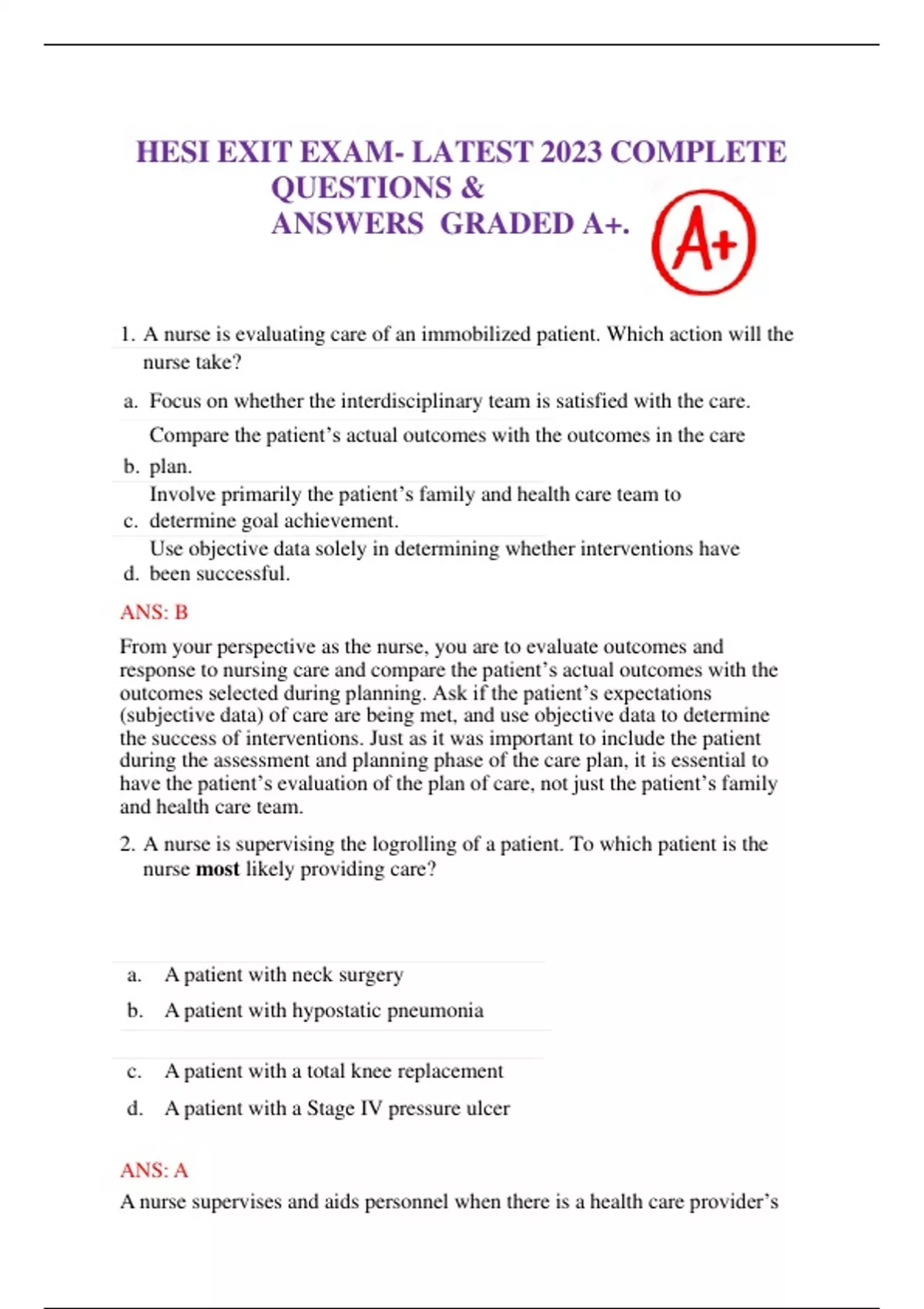 HESI EXIT EXAM- LATEST 2023 COMPLETE QUESTIONS & ANSWERS GRADED A+. 1. A nurse is evaluating care of an immobilized patient. Which action will the nurse take? a. Focus on whether the interdisciplinary team is satisfied with the care. Compare the patient’s actual outcomes with the outcomes in the care b. plan. Involve primarily the patient’s family and health care team to c. determine goal achievement. Use objective data solely in determining whether interventions have d. been successful. ANS: B From your perspective as the nurse, you are to evaluate outcomes and response to nursing care and compare the patient’s actual outcomes with the outcomes selected during planning. Ask if the patient’s expectations (subjective data) of care are being met, and use objective data to determine the success of interventions. Just as it was important to include the patient during the assessment and planning phase of the care plan, it is essential to have the patient’s evaluation of the plan of care, not just the patient’s family and health care team. 2. A nurse is supervising the logrolling of a patient. To which patient is the nurse most likely providing care? a. A patient with neck surgery b. A patient with hypostatic pneumonia c. A patient with a total knee replacement d. A patient with a Stage IV pressure ulcer ANS: A A nurse supervises and aids personnel when there is a health care provider’s order to logroll a patient. Patients who have suffered from spinal cord injury or are recovering from neck, back, or spinal surgery often need to keep the spinal column in straight alignment to prevent further injury. Hypostatic pneumonia, total knee replacement, and Stage IV ulcers do not have to be logrolled. 3. The nurse is providing teaching to an immobilized patient with impaired skin integrity about diet. Which diet will the nurse recommend? a. High protein, high calorie b. High carbohydrate, low fat c. High vitamin A, high vitamin E d. Fluid restricted, bland ANS: A Because the body needs protein to repair injured tissue and rebuild depleted protein stores, give the immobilized patient a high-protein, high-calorie diet. A high-carbohydrate, low-fat diet is not beneficial for an immobilized patient. Vitamins B and C are needed rather than A and E. Fluid restriction can be detrimental to the immobilized patient; this can lead to dehydration. A bland diet is not necessary for immobilized patients. 4. The nurse is caring for a patient who has had a stroke causing total paralysis of the right side. To help maintain joint function and minimize the disability from contractures, passive ROM will be initiated. When should the nurse begin this therapy? a. After the acute phase of the disease has passed b. As soon as the ability to move is lost c. Once the patient enters the rehab unit d. When the patient requests it