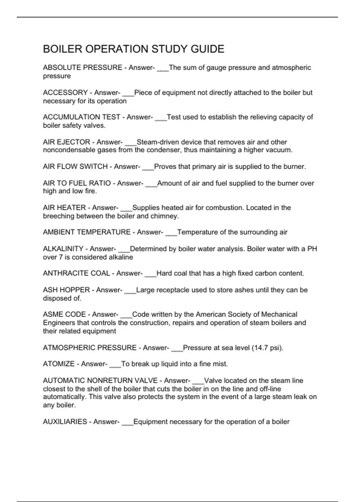 ABSOLUTE PRESSURE - Answer- ___The sum of gauge pressure and atmospheric pressure ACCESSORY - Answer- ___Piece of equipment not directly attached to the boiler but necessary for its operation ACCUMULATION TEST - Answer- ___Test used to establish the relieving capacity of boiler safety valves. AIR EJECTOR - Answer- ___Steam-driven device that removes air and other noncondensable gases from the condenser, thus maintaining a higher vacuum. AIR FLOW SWITCH - Answer- ___Proves that primary air is supplied to the burner. AIR TO FUEL RATIO - Answer- ___Amount of air and fuel supplied to the burner over high and low fire. AIR HEATER - Answer- ___Supplies heated air for combustion. Located in the breeching between the boiler and chimney. AMBIENT TEMPERATURE - Answer- ___Temperature of the surrounding air ALKALINITY - Answer- ___Determined by boiler water analysis. Boiler water with a PH over 7 is considered alkaline ANTHRACITE COAL - Answer- ___Hard coal that has a high fixed carbon content. ASH HOPPER - Answer- ___Large receptacle used to store ashes until they can be disposed of. ASME CODE - Answer- ___Code written by the American Society of Mechanical Engineers that controls the construction, repairs and operation of steam boilers and their related equipment