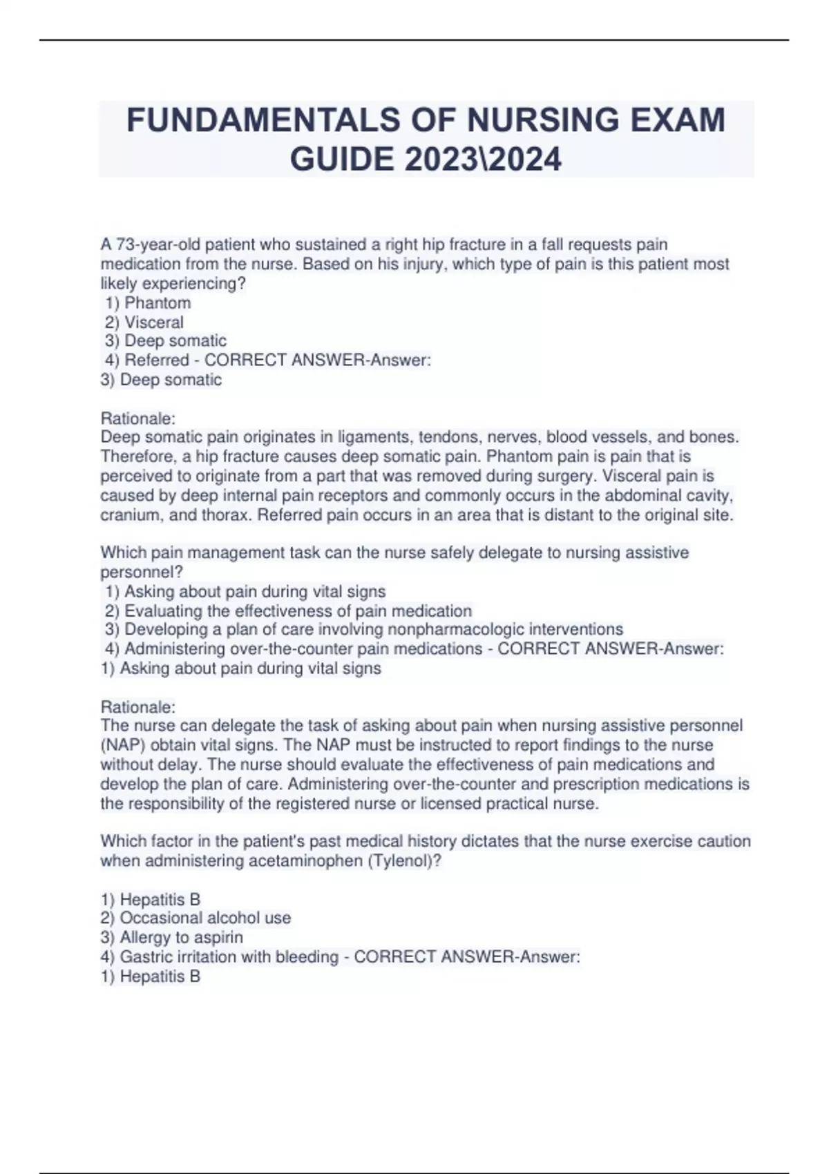 FUNDAMENTALS OF NURSING EXAM GUIDE A 73-year-old patient who sustained a right hip fracture in a fall requests pain medication from the nurse. Based on his injury, which type of pain is this patient most likely experiencing? 1) Phantom 2) Visceral 3) Deep somatic 4) Referred - CORRECT ANSWER-Answer: 3) Deep somatic Rationale: Deep somatic pain originates in ligaments, tendons, nerves, blood vessels, and bones. Therefore, a hip fracture causes deep somatic pain. Phantom pain is pain that is perceived to originate from a part that was removed during surgery. Visceral pain is caused by deep internal pain receptors and commonly occurs in the abdominal cavity, cranium, and thorax. Referred pain occurs in an area that is distant to the original site. Which pain management task can the nurse safely delegate to nursing assistive personnel? 1) Asking about pain during vital signs 2) Evaluating the effectiveness of pain medication 3) Developing a plan of care involving nonpharmacologic interventions 4) Administering over-the-counter pain medications - CORRECT ANSWER-Answer: 1) Asking about pain during vital signs Rationale: The nurse can delegate the task of asking about pain when nursing assistive personnel (NAP) obtain vital signs. The NAP must be instructed to report findings to the nurse without delay. The nurse should evaluate the effectiveness of pain medications and develop the plan of care. Administering over-the-counter and prescription medications is the responsibility of the registered nurse or licensed practical nurse. Which factor in the patient's past medical history dictates that the nurse exercise caution when administering acetaminophen (Tylenol)? 1) Hepatitis B 2) Occasional alcohol use 3) Allergy to aspirin 4) Gastric irritation with bleeding - CORRECT ANSWER-Answer: 1) Hepatitis B Rationale: Even in recommended doses, acetaminophen can cause severe hepatotoxicity in patients with liver disease, such as hepatitis B. Patients who consume alcohol regularly should also use acetaminophen cautiously. Those allergic to aspirin or other nonsteroidal anti-inflammatory drugs (NSAIDs) can use acetaminophen safely. Acetaminophen rarely causes gastrointestinal (GI) problems; therefore, it can be used for those with a history of gastric irritation and bleeding. Which action should the nurse take before administering morphine 4.0 mg intravenously to a patient complaining of incisional pain? 1) Assess the patient's incision. 2) Clarify the order with the prescriber. 3) Assess the patient's respiratory status. 4) Monitor the patient's heart rate. - CORRECT ANSWER-Answer: 3) Assess the patient's respiratory status. Rationale: Before administering an opioid analgesic, such as morphine, the nurse should assess the patient's respiratory status because opioid analgesics can cause respiratory depression. It is not necessary to clarify the order with the physician because morphine 4 mg IV is an appropriate dose. It is not necessary to monitor the patient's heart rate. Which action should the nurse take when preparing patient-controlled analgesia for a postoperative patient? 1) Caution the patient to limit the number of times he presses the dosing button. 2) Ask another nurse to double-check the setup before patient use. 3) Instruct the patient to administer a dose only when experiencing pain. 4) Provide clear, simple instructions for dosing if the patient is cognitively impaired. - CORRECT ANSWER-Answer: 2) Ask another nurse to double-check the setup before patient use. Rationale: As a safeguard to reduce the risk for dosing errors, the nurse should request another nurse to double-check the setup before patient use. The nurse should reassure the patient that the pump has a lockout feature that prevents him from overdosing even if he continues to push the dose administration button. The nurse should also instruct the patient to administer a dose before potentially painful activities, such as walking. Patient-controlled analgesia is contraindicated for those who are cognitively impaired. The nurse administers codeine sulfate 30 mg orally to a patient who underwent craniotomy 3 days ago for a brain tumor. How soon after administration should the nurse reassess the patient's pain? 1) Immediately 2) In 10 minutes 3) In 15 minutes 4) In 60 minutes - CORRECT ANSWER-Answer: 4) In 60 minutes Rationale: Codeine administered by the oral route reaches peak concentration in 60 minutes; therefore, the nurse should reassess the patient's pain 60 minutes after administration. The nurse should reassess pain after 10 minutes when administering codeine by the intramuscular or subcutaneous routes. Drugs administered by the intravenous (IV) route are effective almost immediately; however, codeine is not recommended for IV administration. Which nonsteroidal anti-inflammatory drug might be administered to inhibit platelet aggregation in a patient at risk for thrombophlebitis? 1) Ibuprofen (Motrin) 2) Celecoxib (Celebrex) 3) Aspirin (Ecotrin) 4) Indomethacin (Indocin) - CORRECT ANSWER-Answer: 3) Aspirin (Ecotrin) Rationale: Aspirin is a unique NSAID that inhibits platelet aggregation. Low-dose aspirin therapy is commonly administered to decrease the risk of thrombophlebitis, myocardial infarction, and stroke. Ibuprofen, celecoxib, and indomethacin are NSAIDs, but they do not inhibit platelet aggregation. A client who is receiving epidural analgesia complains of nausea and loss of motor function in his legs. The nurse obtains his blood pressure and notes a drop in his blood pressure from the previous reading. Which complication is the patient most likely experiencing? 1) Infection at the catheter insertion site 2) Side effect of the epidural analgesic 3) Epidural catheter migration 4) Spinal cord damage - CORRECT ANSWER-Answer: 3) Epidural catheter migration Rationale: The patient is exhibiting signs of epidural catheter migration, which include nausea, a decrease in blood pressure, and loss of motor function without an ident