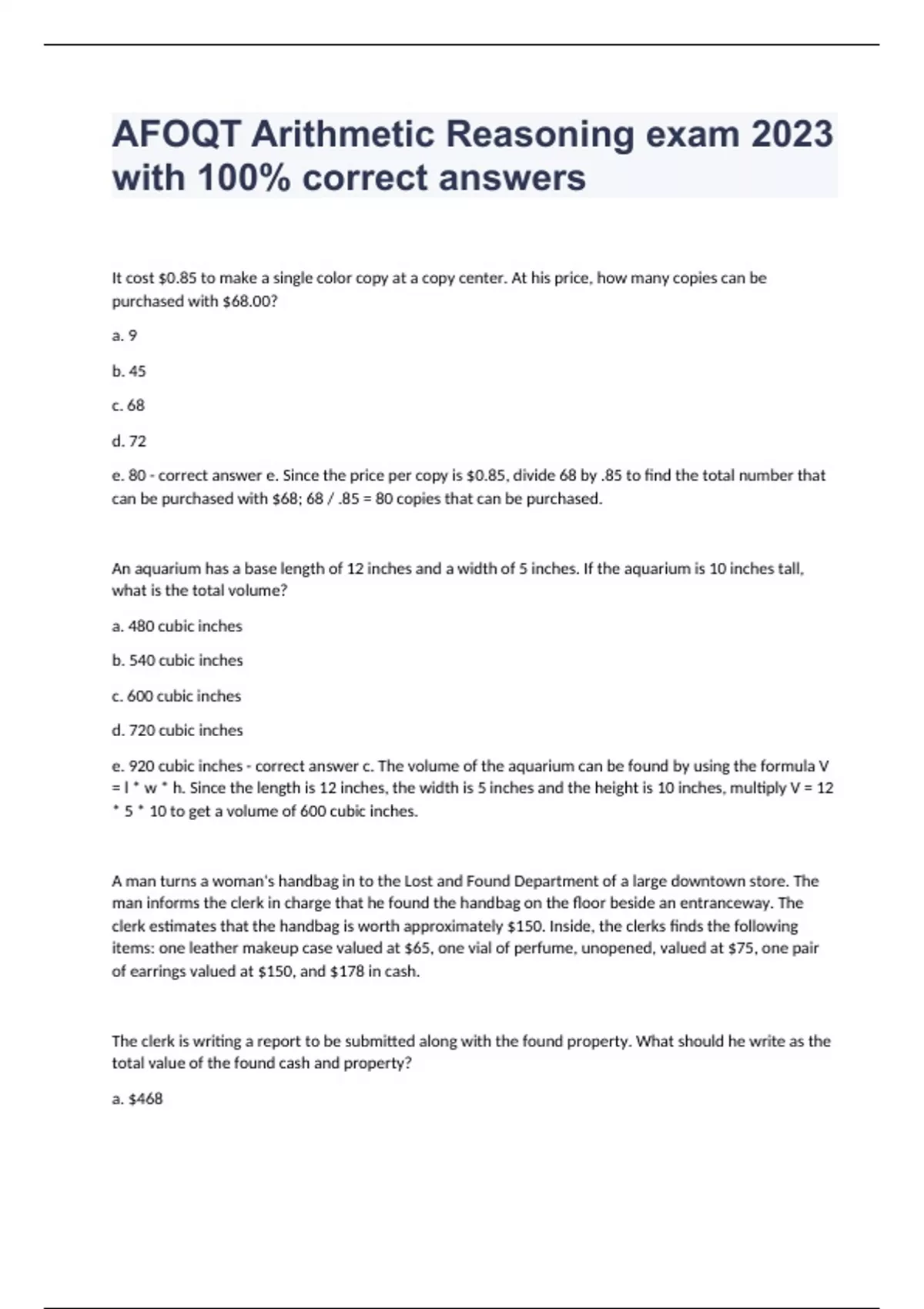 It cost $0.85 to make a single color copy at a copy center. At his price, how many copies can be purchased with $68.00? a. 9 b. 45 c. 68 d. 72 e. 80 - correct answer e. Since the price per copy is $0.85, divide 68 by .85 to find the total number that can be purchased with $68; 68 / .85 = 80 copies that can be purchased. An aquarium has a base length of 12 inches and a width of 5 inches. If the aquarium is 10 inches tall, what is the total volume? a. 480 cubic inches b. 540 cubic inches c. 600 cubic inches d. 720 cubic inches e. 920 cubic inches - correct answer c. The volume of the aquarium can be found by using the formula V = l * w * h. Since the length is 12 inches, the width is 5 inches and the height is 10 inches, multiply V = 12 * 5 * 10 to get a volume of 600 cubic inches. A man turns a woman's handbag in to the Lost and Found Department of a large downtown store. The man informs the clerk in charge that he found the handbag on the floor beside an entranceway. The clerk estimates that the handbag is worth approximately $150. Inside, the clerks finds the following items: one leather makeup case valued at $65, one vial of perfume, unopened, valued at $75, one pair of earrings valued at $150, and $178 in cash. The clerk is writing a report to be submitted along with the found property. What should he write as the total value of the found cash and property? a. $468