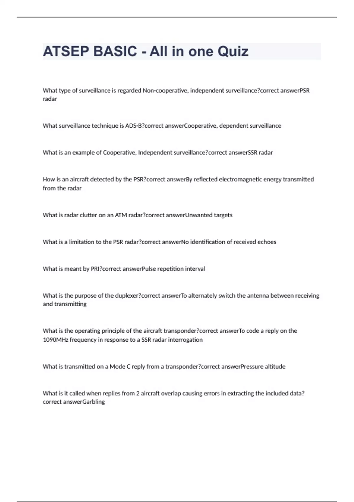 What type of surveillance is regarded Non-cooperative, independent surveillance? PSR radar What surveillance technique is ADS-B? Cooperative, dependent surveillance What is an example of Cooperative, Independent surveillance? SSR radar How is an aircraft detected by the PSR? By reflected electromagnetic energy transmitted from the radar What is radar clutter on an ATM radar? Unwanted targets What is a limitation to the PSR radar? No identification of received echoes What is meant by PRI? Pulse repetition interval What is the purpose of the duplexer? To alternately switch the antenna between receiving and transmitting What is the operating principle of the aircraft transponder? To code a reply on the 1090MHz frequency in response to a SSR radar interrogation What is transmitted on a Mode C reply from a transponder? Pressure altitude What is it called when replies from 2 aircraft overlap causing errors in extracting the included data? Garbling What is a disadvantage of the classical SSR radar? Garbling can occur if 2 aircraft are close in slant range and on the same bearing What is a feature of Mode S? Selective interrogations to reduce FRUIT What is provided with Mode S enhanced surveillance? Downlinked aircraft parameters What is a feature of the Monopulse SSR radar? Improved azimuth resolution and fewer pulses needed to determine position ADS (automatic dependent surveillance) is a surveillance technique for use by ATS in which: Aircraft automatically provide, via data link, data from on-board navigation systems