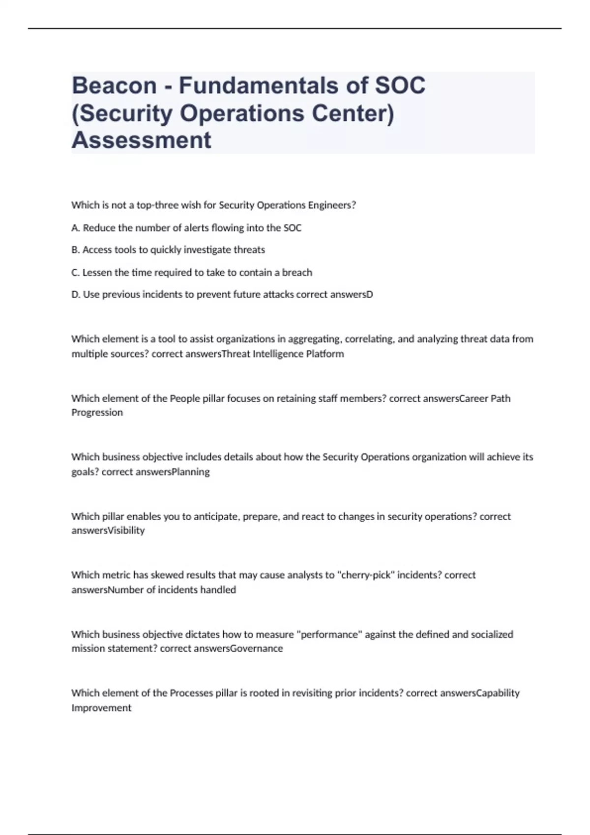 Beacon - Fundamentals of SOC (Security Operations Center) Assessment with 100% correct answers 2023