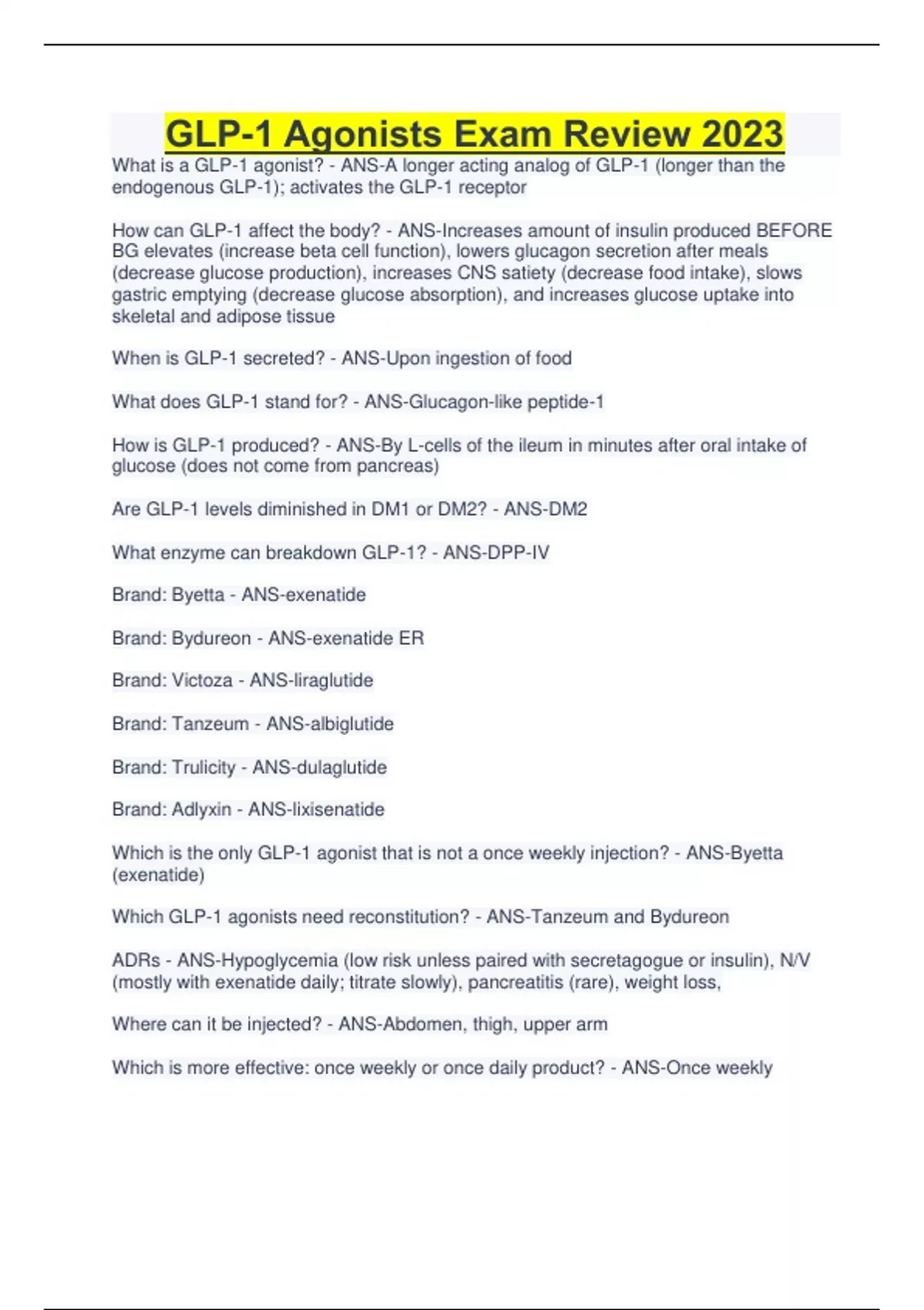 GLP-1 Agonists Exam Review 2023 What is a GLP-1 agonist? - ANS-A longer acting analog of GLP-1 (longer than the endogenous GLP-1); activates the GLP-1 receptor How can GLP-1 affect the body? - ANS-Increases amount of insulin produced BEFORE BG elevates (increase beta cell function), lowers glucagon secretion after meals (decrease glucose production), increases CNS satiety (decrease food intake), slows gastric emptying (decrease glucose absorption), and increases glucose uptake into skeletal and adipose tissue When is GLP-1 secreted? - ANS-Upon ingestion of food What does GLP-1 stand for? - ANS-Glucagon-like peptide-1 How is GLP-1 produced? - ANS-By L-cells of the ileum in minutes after oral intake of glucose (does not come from pancreas) Are GLP-1 levels diminished in DM1 or DM2? - ANS-DM2 What enzyme can breakdown GLP-1? - ANS-DPP-IV Brand: Byetta - ANS-exenatide Brand: Bydureon - ANS-exenatide ER Brand: Victoza - ANS-liraglutide Brand: Tanzeum - ANS-albiglutide Brand: Trulicity - ANS-dulaglutide Brand: Adlyxin - ANS-lixisenatide Which is the only GLP-1 agonist that is not a once weekly injection? - ANS-Byetta (exenatide) Which GLP-1 agonists need reconstitution? - ANS-Tanzeum and Bydureon ADRs - ANS-Hypoglycemia (low risk unless paired with secretagogue or insulin), N/V (mostly with exenatide daily; titrate slowly), pancreatitis (rare), weight loss, Where can it be injected? - ANS-Abdomen, thigh, upper arm Which is more effective: once weekly or once daily product? - Continues...