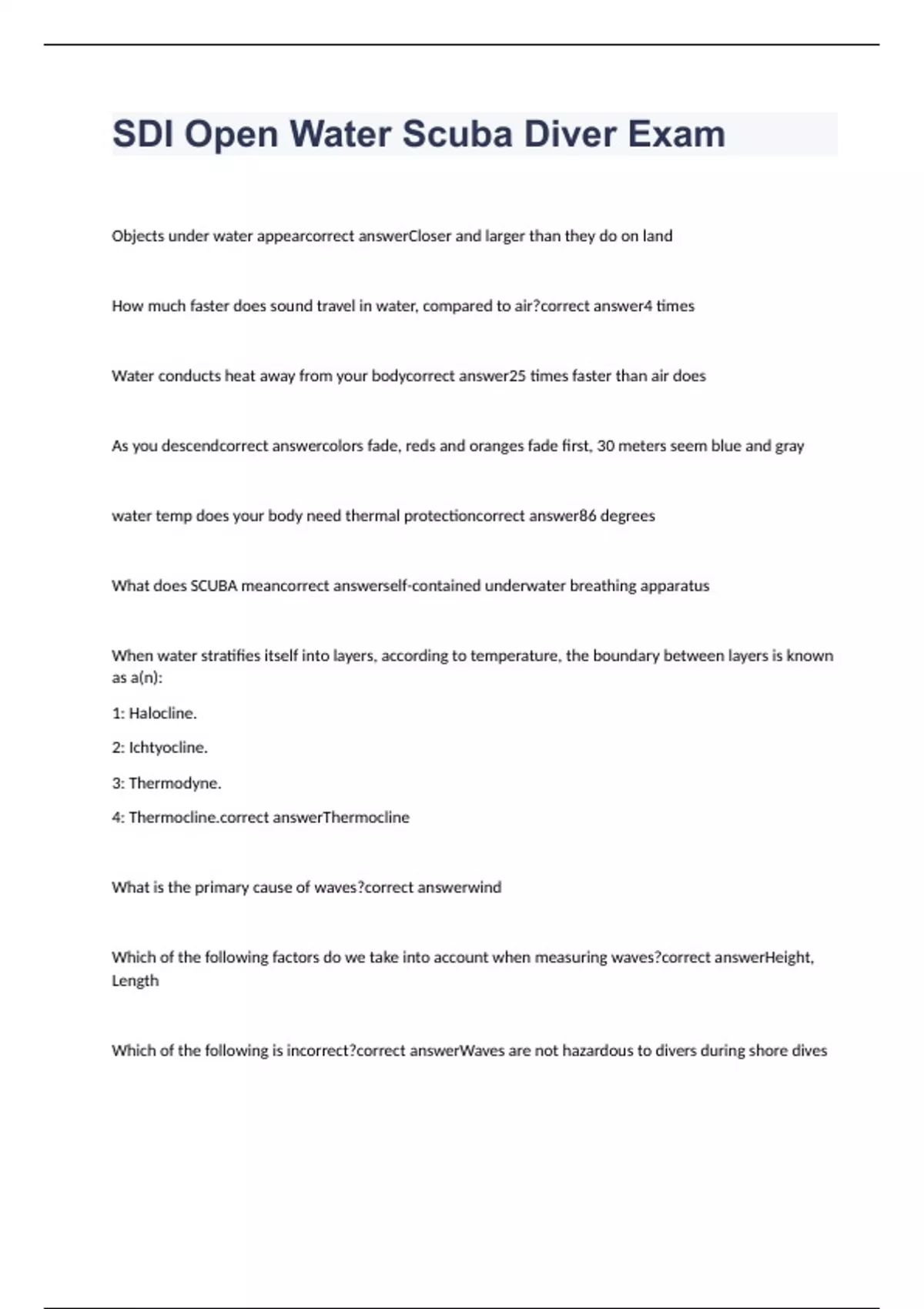 Objects under water appear Closer and larger than they do on land How much faster does sound travel in water, compared to air? 4 times Water conducts heat away from your body 25 times faster than air does As you descend colors fade, reds and oranges fade first, 30 meters seem blue and gray water temp does your body need thermal protection 86 degrees What does SCUBA mean self-contained underwater breathing apparatus When water stratifies itself into layers, according to temperature, the boundary between layers is known as a(n): 1: Halocline. 2: Ichtyocline. 3: Thermodyne. 4: Thermocline. Thermocline What is the primary cause of waves? wind Which of the following factors do we take into account when measuring waves? Height, Length Which of the following is incorrect? Waves are not hazardous to divers during shore dives The consequences of becoming cold under water include the following except improved judgment and coordination Because sound travels faster under water: Its harder to determine the direction from which a sound is coming Entering through surf requires special skills. These skills are often included in beginning scuba course taught in areas in which surf entries are common true which of the following are true Surge is the back-and-forth movement of water caused by passing over head Which of the following are true The sun warming water near the equator, coupled with the earth's rotation, is the primary cause of permanent ocean currents despite its apparent warmth, divers in warm waters still need to consider to wear protection true