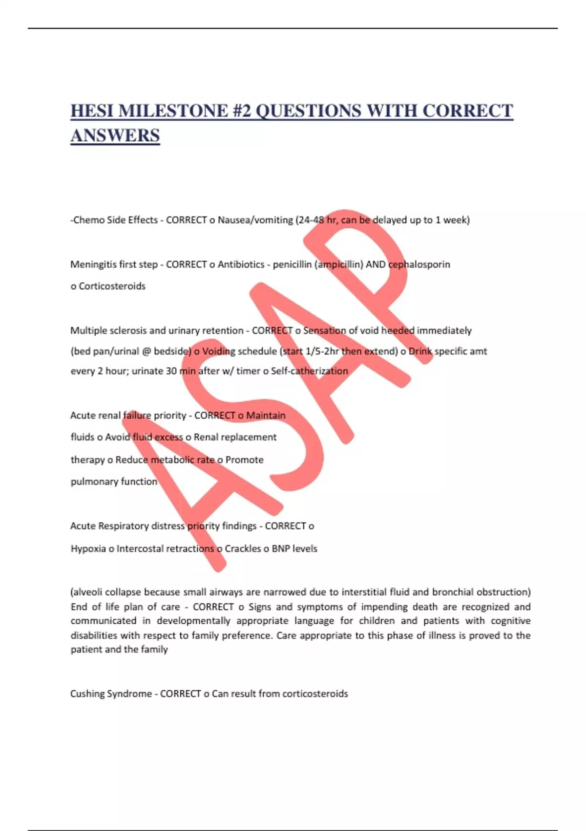 HESI MILESTONE #2 QUESTIONS WITH CORRECT ANSWERS