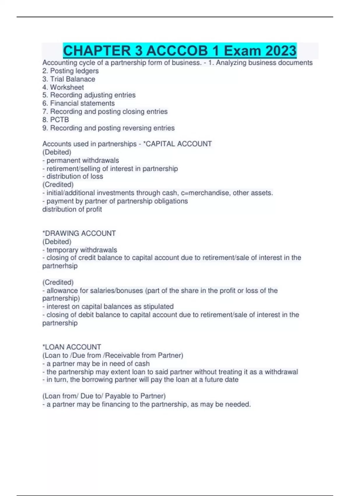 CHAPTER 3 ACCCOB 1 Exam 2023 Accounting cycle of a partnership form of business. - 1. Analyzing business documents 2. Posting ledgers 3. Trial Balanace 4. Worksheet 5. Recording adjusting entries 6. Financial statements 7. Recording and posting closing entries 8. PCTB 9. Recording and posting reversing entries Accounts used in partnerships - *CAPITAL ACCOUNT (Debited) - permanent withdrawals - retirement/selling of interest in partnership - distribution of loss (Credited) - initial/additional investments through cash, c=merchandise, other assets. - payment by partner of partnership obligations distribution of profit *DRAWING ACCOUNT (Debited) - temporary withdrawals - closing of credit balance to capital account due to retirement/sale of interest in the partnerhsip (Credited) - allowance for salaries/bonuses (part of the share in the profit or loss of the partnership) - interest on capital balances as stipulated - closing of debit balance to capital account due to retirement/sale of interest in the partnership *LOAN ACCOUNT...