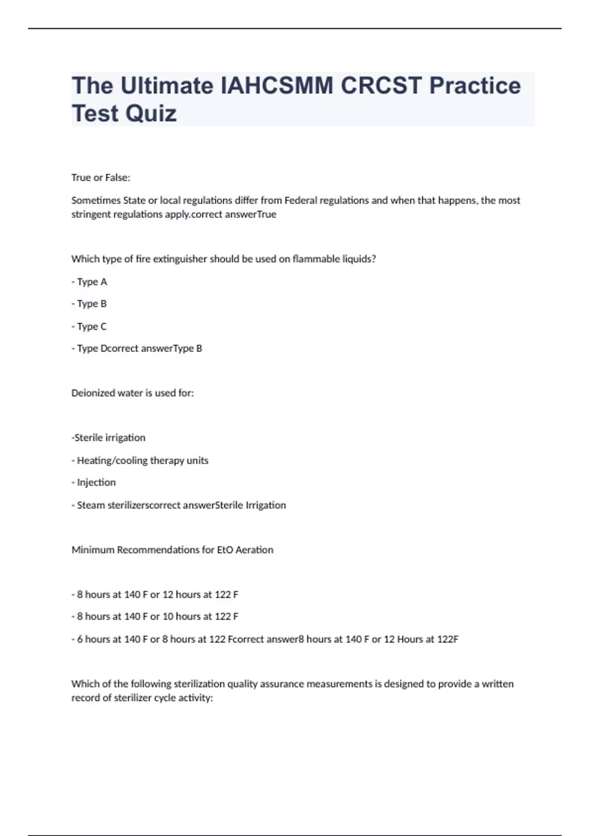 True or False: Sometimes State or local regulations differ from Federal regulations and when that happens, the most stringent regulations apply. True Which type of fire extinguisher should be used on flammable liquids? - Type A - Type B - Type C - Type D Type B Deionized water is used for: -Sterile irrigation - Heating/cooling therapy units - Injection - Steam sterilizers Sterile Irrigation Minimum Recommendations for EtO Aeration - 8 hours at 140 F or 12 hours at 122 F - 8 hours at 140 F or 10 hours at 122 F - 6 hours at 140 F or 8 hours at 122 F 8 hours at 140 F or 12 Hours at 122F Which of the following sterilization quality assurance measurements is designed to provide a written record of sterilizer cycle activity: - Biological tests - Bowie dick tests - Mechanical recording charts/printouts - Chemical integrators Mechanical recording charts/printouts