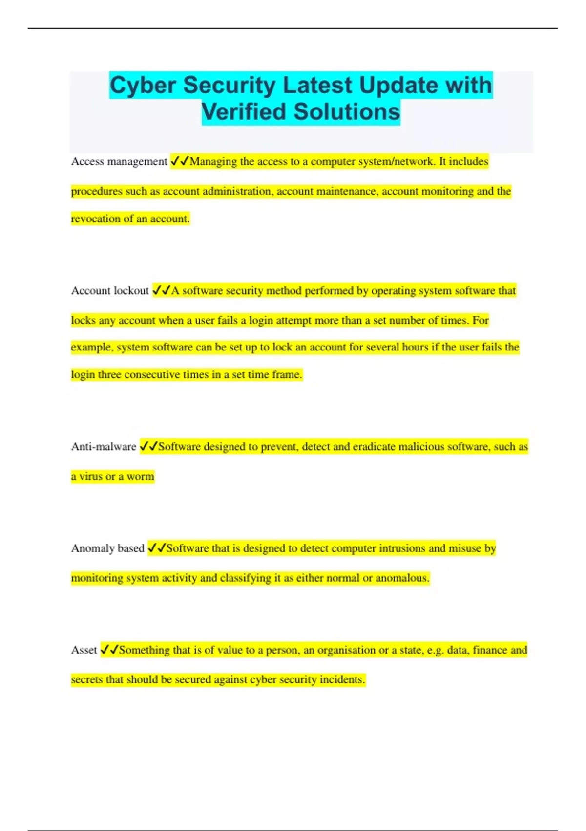 Cyber Security Latest Update with Verified Solutions Access management Managing the access to a computer system/network. It includes procedures such as account administration, account maintenance, account monitoring and the revocation of an account. Account lockout A software security method performed by operating system software that locks any account when a user fails a login attempt more than a set number of times. For example, system software can be set up to lock an account for several hours if the user fails the login three consecutive times in a set time frame. Anti-malware Software designed to prevent, detect and eradicate malicious software, such as a virus or a worm Anomaly based Software that is designed to detect computer intrusions and misuse by monitoring system activity and classifying it as either normal or anomalous. Asset Something that is of value to a person, an organisation or a state, e.g. data, finance and secrets that should be secured against cyber security incidents. Attacker Individuals or organisations that target computer systems/networks illegally. Audit trail A record of activities on a computer system/network, for example, a record of modifications to data or access to parts of a system/network. Availability Data/information stored on a computer system/network must be available to authorised users and organisations and be protected from unauthorised deletion. Biometric access Access to a computer system/network using technologies that measure and analyse human body characteristics for authentication purposes, such as DNA, fingerprints, retinas, voice patterns, facial patterns and hand measurements. Botnet A network of computers infected with malicious software and controlled without the owners' knowledge, for example, to send spam or hoax emails. Business continuity plan A plan to continue operations that an organisation will follow if it is affected by a cyber security incident Confidentiality Information stored on a computer system/network must be protected against unintended or unauthorised access. Data confidentiality is a measure of the ability of a system to protect its data. Cyber criminal An individual who commits illegal activities using computers and the Internet. Cyber dependant Illegal activities dependent on the use of computers and the Internet, such as hacking or the distribution of malware on a network. Cyber enabled Illegal activities that could be undertaken without the use of computers, such as fraud but that are enabled by the use of computers, such as fraudulently obtaining money for goods online. Cyber security Refers to technologies, processes and practices designed to protect computers, networks, software and data from attack, damage or unauthorised access and aims to protect data confidentiality, integrity and availability. Cyber security incident An unwanted/unexpected event, such as an intrusion into a computer system/network, such as the spread of malware. Cyber security incident report A report that documents the details of a cyber security incident, such as the type of incident, when it occurred, how it was performed, etc. Denial of service An attempt to disrupt a network/business/organisation by issuing more requests than a system is able to cope with, it can be performed with malicious intent or as a protest. Disaster recovery plan A plan that documents a set of procedures for an organisation to follow in order to recover and protect a computer system and its data in the event of a cyber security incident. Encryption A method that is used to attempt to ensure data security by use of encrypted (secret) code. In order to read the contents of an encrypted message or file, someone must have access to a secret key or password that will enable them to decrypt the message or file. Escalation of privileges Exploiting a weakness or weaknesses in an operating system or software application, such as a bug, design flaw or configuration oversight and gaining elevated access to resources that are normally protected. Ethical hacking An individual who attempts to penetrate a computer system/network on behalf of its owners for the purpose of finding security vulnerabilities that a malicious hacker could potentially exploit. He or she is also known as a white hat hacker. He or she can also work alone. Firewall Software that is designed to protect a computer system/network from unauthorised access and intrusion. Fuzzing A method that is used to test the security of software. Hacking A method of gaining unauthorised access to a computer system/network. Hacker An individual who gains unauthorised access to a computer system/network. Hacktivist An individual who gains unauthorised access to computer system/network for social or political purposes. Hoax email Usually an email message warning recipients of a non-existent threat, usually forging quotes supposedly from authorities such as Microsoft and IBM. Honeypot Decoy servers or computer systems that are set up to gather information on intruders or attackers of computer systems/networks. Host firewall Software that runs on a single host computer that restricts incoming and outgoing network activity for that host computer only. It can be used to prevent a host computer from becoming infected and stop infected host computers from spreading malware to other hosts computers. Insider An individual working inside an organisation, a trusted employee, who performs an illegal action, such as hacking. Integrity Integrity of data aims to protect data from unauthorised modification. Intrusion detection system Software that monitors network or system activities for unexpected or malicious activities. Intrusion prevention system Software that examines network traffic flows to detect and prevent vulnerability exploits. Malware Software that is designed to cause disruption or damage to data and/a computer system/network. Mitigate To lessen an impact, for example, the impact of a cyber security incident or a risk