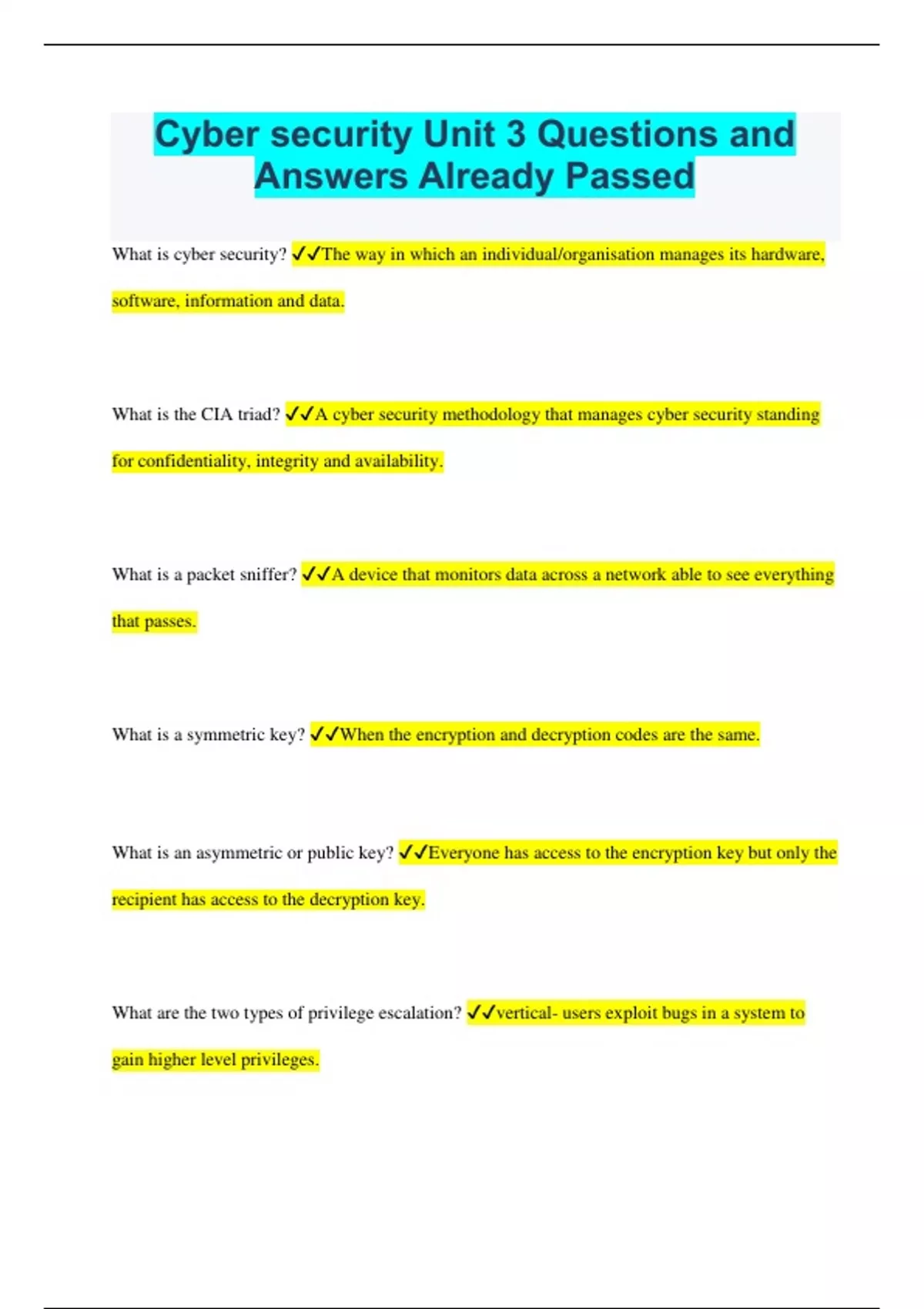 Cyber security Unit 3 Questions and Answers Already Passed