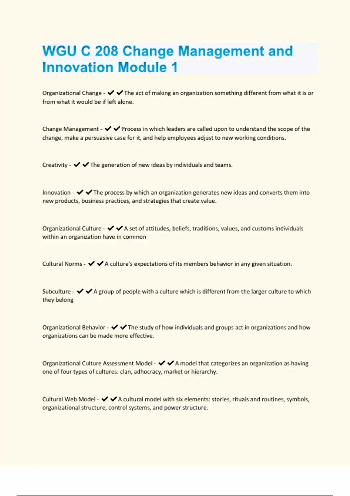 Organizational Change -The act of making an organization something different from what it is or from what it would be if left alone. Change Management - Process in which leaders are called upon to understand the scope of the change, make a persuasive case for it, and help employees adjust to new working conditions. Creativity - The generation of new ideas by individuals and teams. Innovation - The process by which an organization generates new ideas and converts them into new products, business practices, and strategies that create value. Organizational Culture - A set of attitudes, beliefs, traditions, values, and customs individuals within an organization have in common Cultural Norms - A culture's expectations of its members behavior in any given situation. Subculture - A group of people with a culture which is different from the larger culture to which they belong Organizational Behavior - The study of how individuals and groups act in organizations and how organizations can be made more effective. Organizational Culture Assessment Model - A model that categorizes an organization as having one of four types of cultures: clan, adhocracy, market or hierarchy. Cultural Web Model - A cultural model with six elements: stories, rituals and routines, symbols, organizational structure, control systems, and power structure.Rituals and Routines - The daily behavior and actions that are considered to be approved and valued. Symbols - In an organization this includes visual cues such as logos, dress code, what type of neighborhood the facility is located in, how fancy the furnishings are, etc.