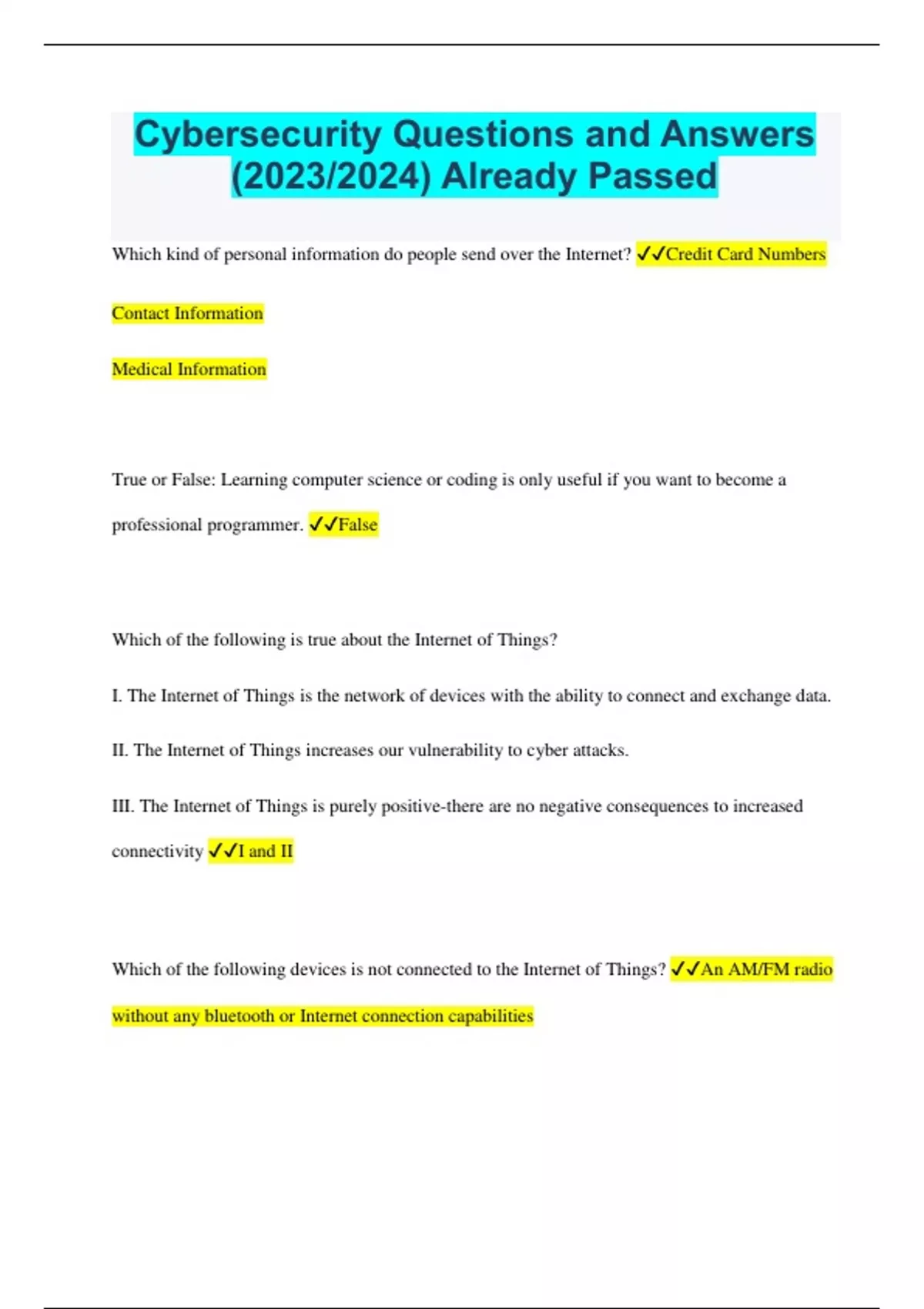 Cybersecurity Questions and Answers (2023/2024) Already Passed Which kind of personal information do people send over the Internet? Credit Card Numbers Contact Information Medical Information True or False: Learning computer science or coding is only useful if you want to become a professional programmer. False Which of the following is true about the Internet of Things? I. The Internet of Things is the network of devices with the ability to connect and exchange data. II. The Internet of Things increases our vulnerability to cyber attacks. III. The Internet of Things is purely positive-there are no negative consequences to increased connectivity I and II Which of the following devices is not connected to the Internet of Things? An AM/FM radio without any bluetooth or Internet connection capabilities Which of the following is not true about cybersecurity? Cyber attacks can devastate large organizations, but individuals are largely unaffected. In 2016, online fraud cases in the United States resulted in victim losses totaling: Over $1.2 billion Which of the following is true about jobs in the field of cybersecurity? There are many unfilled cybersecurity positions right now, and there will be even more unfilled positions in the next couple of years. Alice is buying books from an online retail site, and she finds that she is able to change the price of a book from $19.99 to $1.99. Which part of the CIA triad has been broken? I In cybersecurity, what does CIA stand for? Confidentiality, Integrity, Availability True or False: In 2016, online fraud cases in the United States resulted in victim losses totaling over $1 billion True Robert is on an online auction site trying to make a bid on a new computer. As he tries to make a bid, the site crashes and he loses the auction. Which part of the CIA triad was broken? Availability Alice is checking her grades on a school computer in the library, and she forgets to log out before she leaves. Bob gets on the computer after her, and he sees her grades for all of her classes. Which part of the CIA triad was broken? Confidentiality Which of the following is true of the WannaCry ransomware attack? Hackers locked down computers and demanded payment to unlock Medical services were disrupted as a result of the attack The attack was possible because people had not updated their operating systems Which of the following statements are true? I. There has been a decrease in the number of cyber attacks in the past decade. II. Cybersecurity is the protection of computer systems, networks, and data from digital attacks. III. Cyber attacks in the past few years have impacted individuals, governments, and organizations. II and III Sarah puts a lock on her diary so only she can read it. Her little brother breaks the lock and reads her diary. Which part of the CIA triad was broken? Confidentiality True or False: The Internet of Things decreases our vulnerability to cyber attacks. False Which of the following most accurately describes the Internet of Things? The network of devices with the ability to connect and exchange data Which of the following devices is not a part of the Internet of Things? A physical combination padlock for your gym locker Cynthia discovers that she has the ability to modify the lunch menu posted on her school's website. She edits the website so for lunch every day, it says "Green Eggs and Ham". Which part of the CIA triad was broken? Integrity What is a CIA triad? The CIA Triad is a widely-accepted security measure that should be guaranteed in evry secure system.