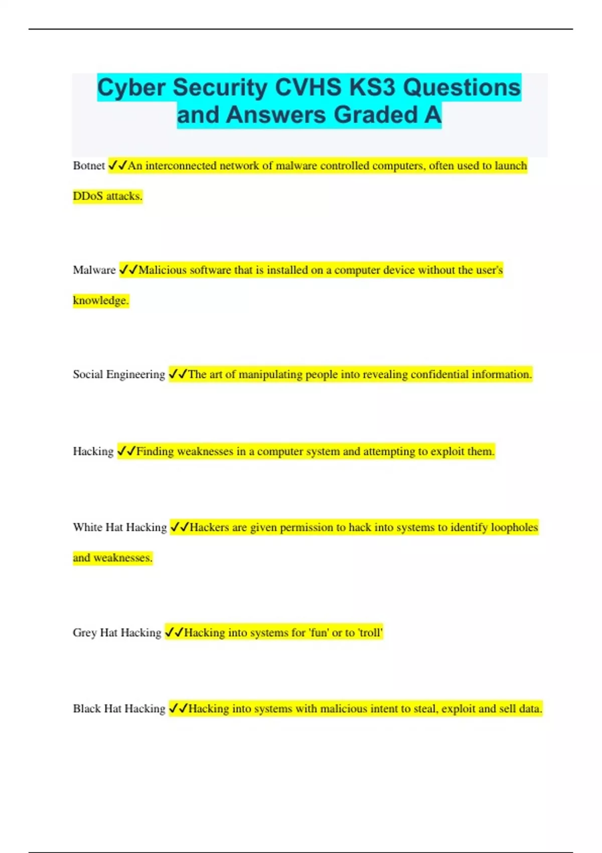 Cyber Security CVHS KS3 Questions and Answers Graded A