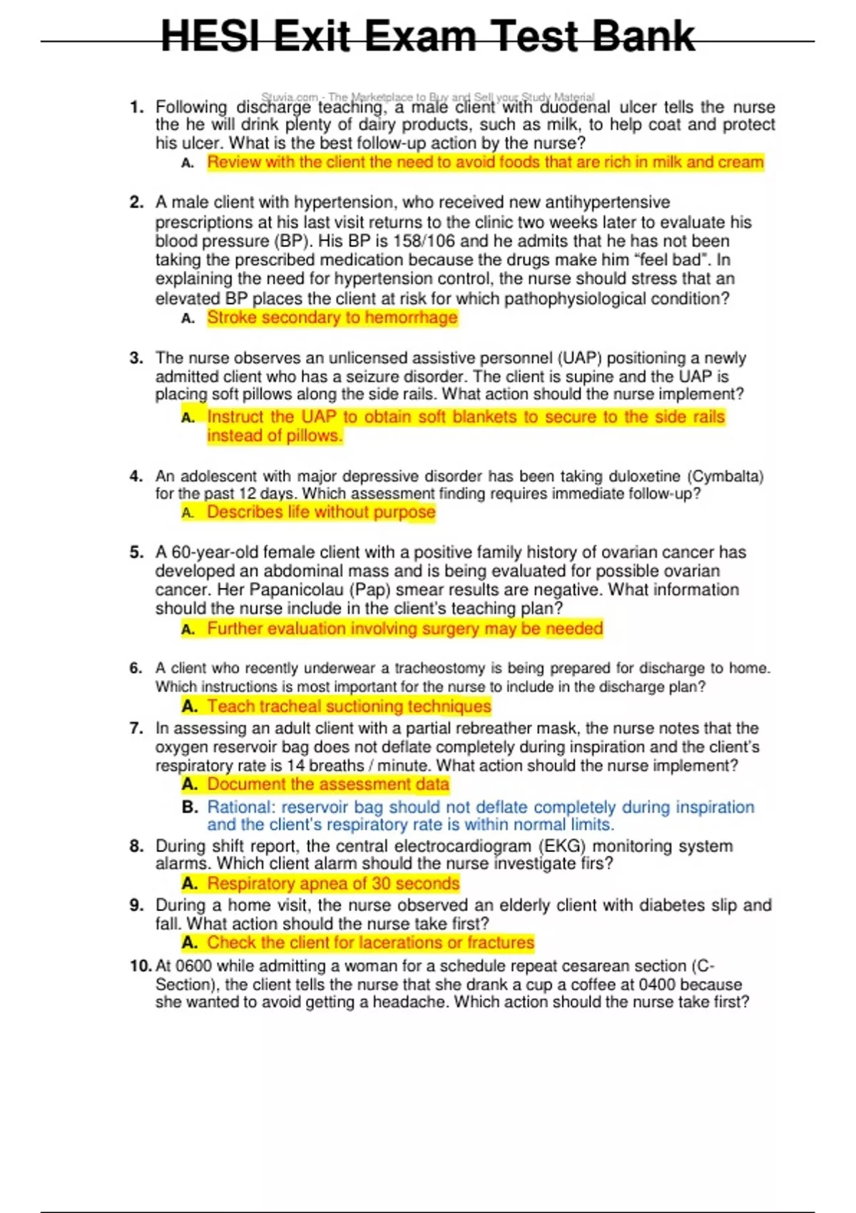 HESI Exit Exam Test Bank 1. Following disc S h tu a vi r a g .c e om t - e T a he ch M i a n rk g et , pl a ace m to a B l u e y a c n l d ie S n ell t yo w ur it S h tud d y u M o a d te e ria n l al ulcer tells the nurse the he will drink plenty of dairy products, such as milk, to help coat and protect his ulcer. What is the best follow-up action by the nurse? A. Review with the client the need to avoid foods that are rich in milk and cream 2. A male client with hypertension, who received new antihypertensive prescriptions at his last visit returns to the clinic two weeks later to evaluate his blood pressure (BP). His BP is 158/106 and he admits that he has not been taking the prescribed medication because the drugs make him “feel bad”. In explaining the need for hypertension control, the nurse should stress that an elevated BP places the client at risk for which pathophysiological condition? A. Stroke secondary to hemorrhage 3. The nurse observes an unlicensed assistive personnel (UAP) positioning a newly admitted client who has a seizure disorder. The client is supine and the UAP is placing soft pillows along the side rails. What action should the nurse implement? A. Instruct the UAP to obtain soft blankets to secure to the side rails instead of pillows. 4. An adolescent with major depressive disorder has been taking duloxetine (Cymbalta) for the past 12 days. Which assessment finding requires immediate follow-up? 5. A 60-year-old female client with a positive family history of ovarian cancer has developed an abdominal mass and is being evaluated for possible ovarian cancer. Her Papanicolau (Pap) smear results are negative. What information should the nurse include in the client’s teaching plan? A. Further evaluation involving surgery may be needed 6. A client who recently underwear a tracheostomy is being prepared for discharge to home. Which instructions is most important for the nurse to include in the discharge plan? A. Teach tracheal suctioning techniques 7. In assessing an adult client with a partial rebreather mask, the nurse notes that the oxygen reservoir bag does not deflate completely during inspiration and the client’s respiratory rate is 14 breaths / minute. What action should the nurse implement? A. Document the assessment data B. Rational: reservoir bag should not deflate completely during inspiration and the client’s respiratory rate is within normal limits. 8. During shift report, the central electrocardiogram (EKG) monitoring system alarms. Which client alarm should the nurse investigate firs? A. Respiratory apnea of 30 seconds 9. During a home visit, the nurse observed an elderly client with diabetes slip and fall. What action should the nurse take first? A. Check the client for lacerations or fractures 10. At 0600 while admitting a woman for a schedule repeat cesarean section (CSection), the client tells the nurse that she drank a cup a coffee at 0400 because she wanted to avoid getting a headache. Which action should the nurse take first? A. Describes life without purpose A. Medicare A. Toasted wheat bread and jelly A. 11.After placing a stethoscope as seen in the picture, the nurse auscultates S1 and S2 heart sounds. To determine if an S3 heart sound is present, what action should the nurse take first? A. Listen with the bell at the same location 12.A 66-year-old woman is retiring and will no longer have a health insurance through her place of employment. Which agency should the client be referred to by the employee health nurse for health insurance needs? 13. A client who is taking an oral dose of a tetracycline complains of gastrointestinal upset. What snack should the nurse instruct the client to take with the tetracycline? 14. Following a lumbar puncture, a client voices several complaints. What complaint indicated to the nurse that the client is experiencing a complication? A. “I have a headache that gets worse when I sit up” B. “I am having pain in my lower back when I move my legs” C. “My throat hurts when I swallow” D. “I feel sick to my stomach and am going to throw up” 15.An elderly client seems confused and reports the onset of nausea, dysuria, and urgency with incontinence. Which action should the nurse implement? A. Obtain a clean catch mid-stream specimen 16.The nurse is assisting the mother of a child with phenylketonuria (PKU) to select foods that are in keeping with the child’s dietary restrictions. Which foods are contraindicated for this child? A. Foods sweetened with aspartame 17.Before preparing a client for the first surgical case of the day, a part-time scrub nurse asks the circulating nurse if a 3 minute surgical hand scrub is adequate preparation for this client. Which response should the circulating nurse provide? 18.Which breakfast selection indicates that the client understands the nurse’s instructions about the dietary management of osteoporosis? 19. The charge nurse of a critical care unit is informed at the beginning of the shift that less than the optimal number of registered nurses will be working that shift. In planning assignments, which client should receive the most care hours by a registered nurse (RN)? A. An 82-year-old client with Alzheimer’s disease newly-fractures femur who has a Foley catheter and soft wrist restrains applied
