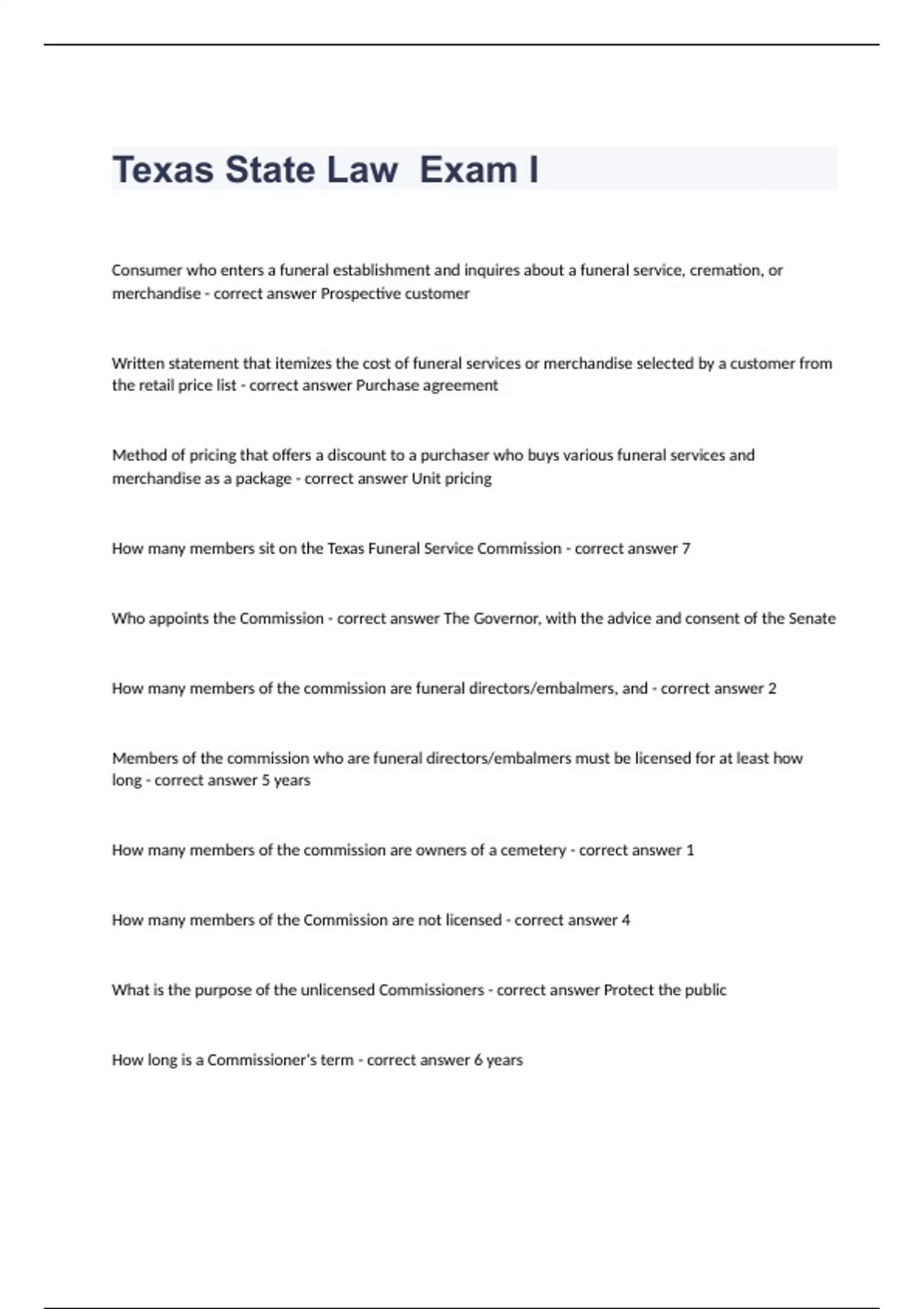 Consumer who enters a funeral establishment and inquires about a funeral service, cremation, or merchandise - correct answer Prospective customer Written statement that itemizes the cost of funeral services or merchandise selected by a customer from the retail price list - correct answer Purchase agreement Method of pricing that offers a discount to a purchaser who buys various funeral services and merchandise as a package - correct answer Unit pricing How many members sit on the Texas Funeral Service Commission - correct answer 7 Who appoints the Commission - correct answer The Governor, with the advice and consent of the Senate How many members of the commission are funeral directors/embalmers, and - correct answer 2 Members of the commission who are funeral directors/embalmers must be licensed for at least how long - correct answer 5 years How many members of the commission are owners of a cemetery - correct answer 1 How many members of the Commission are not licensed - correct answer 4 What is the purpose of the unlicensed Commissioners - correct answer Protect the public How long is a Commissioner's term - correct answer 6 years