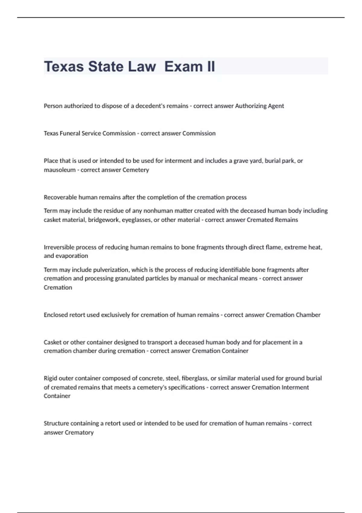 Person authorized to dispose of a decedent's remains - correct answer Authorizing Agent Texas Funeral Service Commission - correct answer Commission Place that is used or intended to be used for interment and includes a grave yard, burial park, or mausoleum - correct answer Cemetery Recoverable human remains after the completion of the cremation process Term may include the residue of any nonhuman matter created with the deceased human body including casket material, bridgework, eyeglasses, or other material - correct answer Cremated Remains Irreversible process of reducing human remains to bone fragments through direct flame, extreme heat, and evaporation Term may include pulverization, which is the process of reducing identifiable bone fragments after cremation and processing granulated particles by manual or mechanical means - correct answer Cremation Enclosed retort used exclusively for cremation of human remains - correct answer Cremation Chamber Casket or other container designed to transport a deceased human body and for placement in a cremation chamber during cremation - correct answer Cremation Container Rigid outer container composed of concrete, steel, fiberglass, or similar material used for ground burial of cremated remains that meets a cemetery's specifications - correct answer Cremation Interment Container Structure containing a retort used or intended to be used for cremation of human remains - correct answer Crematory