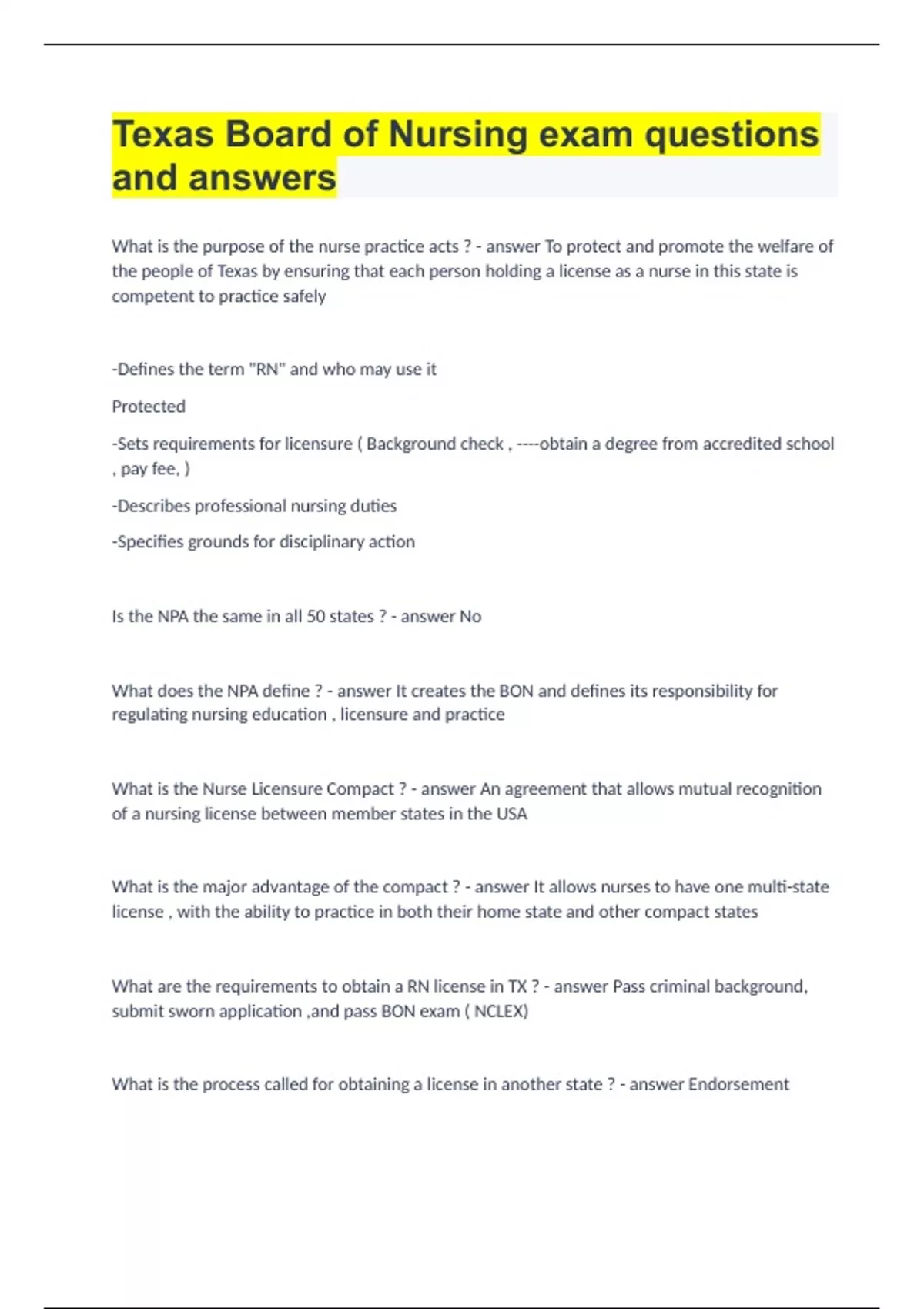 What is the purpose of the nurse practice acts ? To protect and promote the welfare of the people of Texas by ensuring that each person holding a license as a nurse in this state is competent to practice safely -Defines the term "RN" and who may use it Protected -Sets requirements for licensure ( Background check , ----obtain a degree from accredited school , pay fee, ) -Describes professional nursing duties -Specifies grounds for disciplinary action Is the NPA the same in all 50 states ? No What does the NPA define ? It creates the BON and defines its responsibility for regulating nursing education , licensure and practice What is the Nurse Licensure Compact ? An agreement that allows mutual recognition of a nursing license between member states in the USA What is the major advantage of the compact ? It allows nurses to have one multi-state license , with the ability to practice in both their home state and other compact states What are the requirements to obtain a RN license in TX ? Pass criminal background, submit sworn application ,and pass BON exam ( NCLEX) What is the process called for obtaining a license in another state ? Endorsement What is required for a nurse in Texas to renew her license? Proof and continuing education and no criminal record How often do you renew license ? Every 2 years What is the purpose of the BON ? To protect and promote the welfare of the people of Texas by ensuring that each person holding a license as a nurse in the State of Texas is competent to practice safely. How are members of the BON selected and what type of backgrounds do they have ? Appointed by the governor with the advice and consent of the senate. They do not have to be in the medical field to sit on the BON What does the BON do ? -Enforcement of the NPA -adopt rules and regulations to implement NPA -Investigation/disciplinary process -Deny, revoke, suspend license -Remedial activity -Approval of educational programs All levels -Licensure of nurses ( LVN and RN ) What might prevent a person from obtaining a nursing license ? Not passing the NCLEX, with holding criminal background information, not getting fingerprinted, When does Professor Patten's license expire ? 9/3/2016 What was the NCLEX passing rate for TCU Nursing in 2014 and is it higher or lower than the TX BSN average ? 86.34% , higher Name a difference between an RN and LVN scope of practice ? -The LVN scope of practice requires appropriate supervision of a registered nurse, advanced practice registered nurse, physician assistant, physician, dentist, or podiatrist. The LVN cannot do an initial assessment on a patient . -The RN takes responsibility and accepts accountability for practicing within the legal scope of practice and is prepared to work in all health care settings, and may engage in independent nursing practice without supervision by another health care provider. Observe , assess , intervene