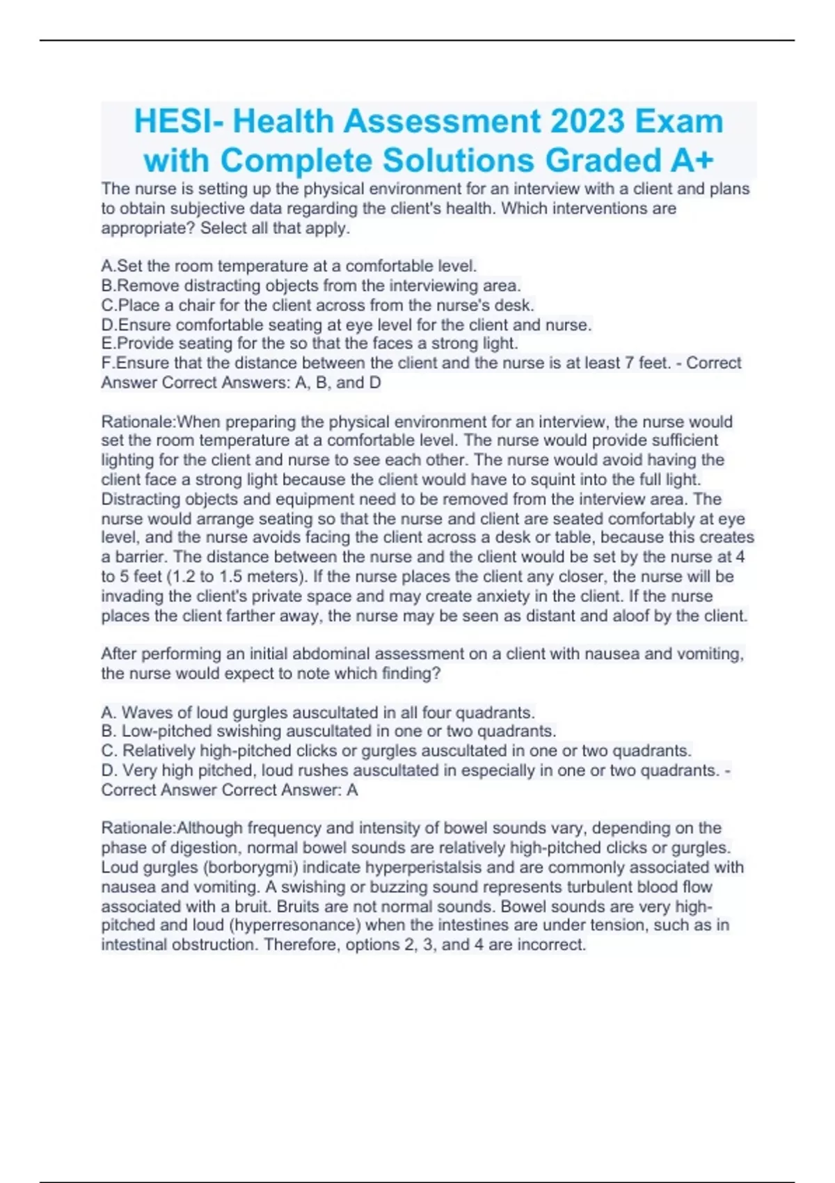 D. Very high pitched, loud rushes auscultated in especially in one or two quadrants. - Correct Answer Correct Answer: A