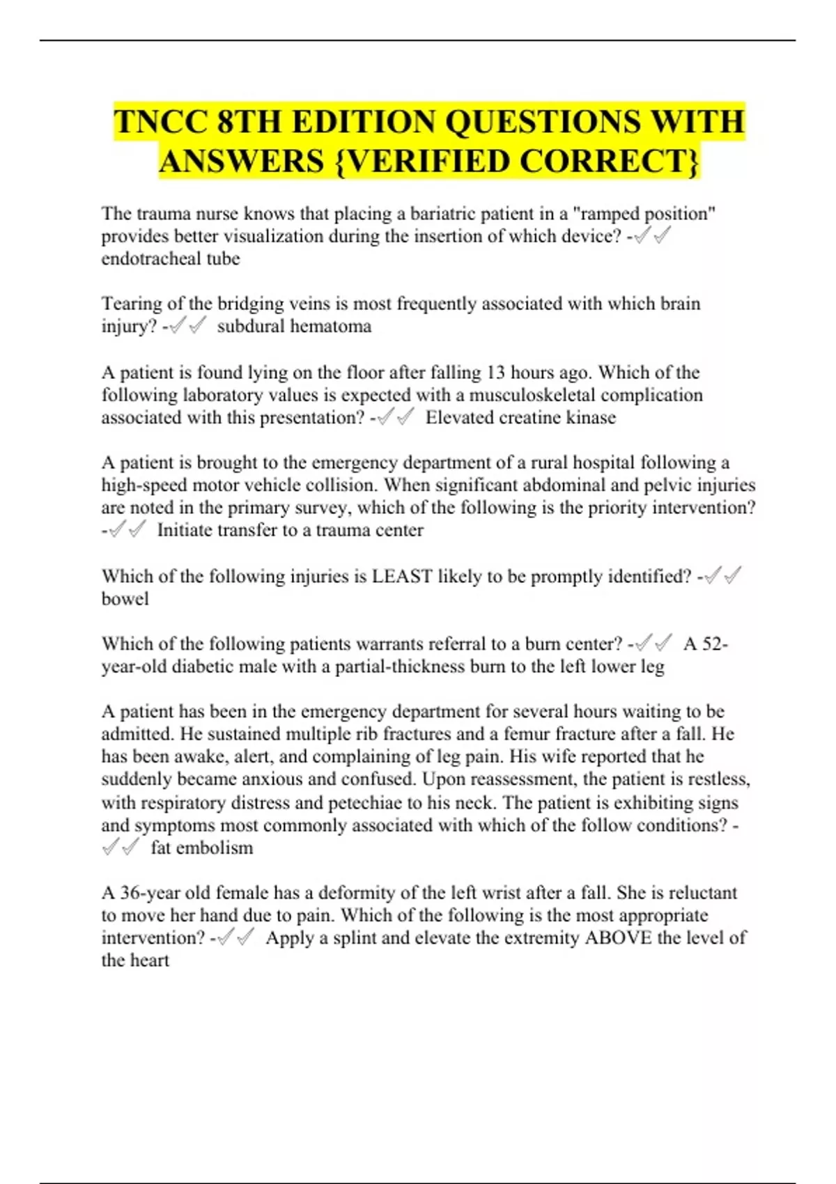 TNCC 8TH EDITION QUESTIONS WITH ANSWERS {VERIFIED CORRECT}