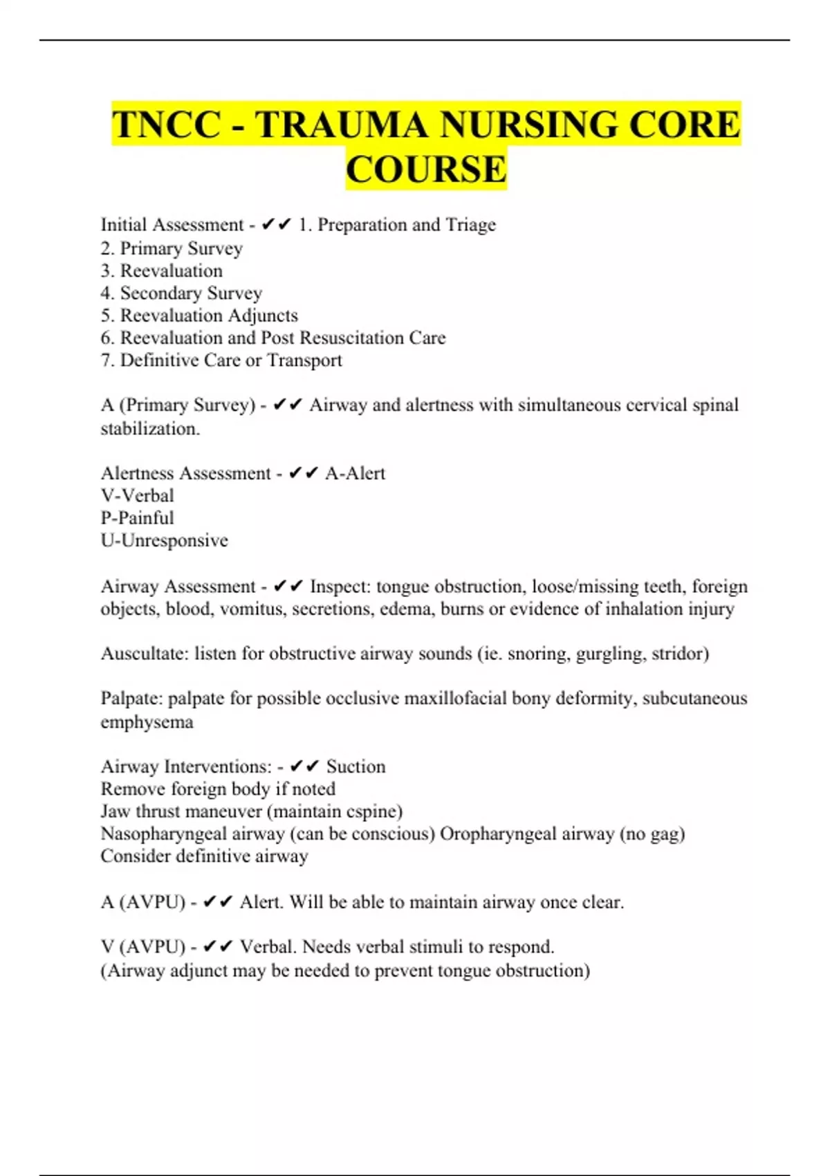 Initial Assessment - 1. Preparation and Triage 2. Primary Survey 3. Reevaluation 4. Secondary Survey 5. Reevaluation Adjuncts 6. Reevaluation and Post Resuscitation Care 7. Definitive Care or Transport A (Primary Survey) - Airway and alertness with simultaneous cervical spinal stabilization. Alertness Assessment - A-Alert V-Verbal P-Painful U-Unresponsive Airway Assessment - Inspect: tongue obstruction, loose/missing teeth, foreign objects, blood, vomitus, secretions, edema, burns or evidence of inhalation injury Auscultate: listen for obstructive airway sounds (ie. snoring, gurgling, stridor) Palpate: palpate for possible occlusive maxillofacial bony deformity, subcutaneous emphysema Airway Interventions: - Suction Remove foreign body if noted Jaw thrust maneuver (maintain cspine) Nasopharyngeal airway (can be conscious) Oropharyngeal airway (no gag) Consider definitive airway A (AVPU) - Alert. Will be able to maintain airway once clear. V (AVPU) - Verbal. Needs verbal stimuli to respond. (Airway adjunct may be needed to prevent tongue obstruction) P (AVPU) - Painful. Responds only to painful stimuli. (Airway adjunct may be needed while determining need for intubation) U (AVPU) - Unresponsive. Does not respond to any stimuli. B (Primary Survey) - Breathing and Ventilation Breathing and Ventilation Assessment - Inspect: spontaneous breathing, symmetrical rise and fall, depth/pattern/rate of respirations, accessory muscle use, diaphragmatic breathing, skin color (normal, pale, flushed, cyanotic), contusions/abrasions/deformities (signs of underlying injury), open pneumothoraces (sucking chest wound), JVD, tracheal position, signs of inhalation injury Auscultate: presence, absence and equality of breath sounds at 2nd intercostal space midclavicular line and bases at the fifth intercostal space anterior axillary line Palpate: bony structures, possible rib fractures, SQ emphysema, soft tissue injury, JV pulsations at suprasternal notch or supraclavicular area Life-threatening pulmonary injuries requiring immediate intervention: open pneumothorax, tension pneumothorax, flail chest, hemothorax. Breathing and Ventilation Intervention - Breathing absent: jaw-thrust maneuver, oral airway adjunct, assist ventilation with bag-mask device, prepare for definitive airway Breathing present: NRB. Determine if ventilation effective: etCO2 35-45, SpO2 94% or higher. If ineffective: assist with bag-mask and determine need for definitive airway C (Primary Survey) - Circulation and Control of Hemorrhage Circulation and Control of Hemorrhage Assessment - Inspect: Uncontrolled external bleeding, skin color Auscultate: Muffled heart sounds - may indicate pericardial tamponade Palpate: carotid and/or femoral pulses for rate, rhythm, strength Circulation and Control of Hemorrhage Interventions - Control and treat external bleeding: apply direct pressure, elevate bleeding extremity, apply pressure over arterial sites, consider use of a tourniquet. 2 large bore IVs, if unable consider IO, obtain labs and crossmatch. Initiate IVF of warmed isotonic crystalloid solution. Consider blood products after 2L. **Large volumes of fluid lead to dilution coagulopathy which worsens metabolic acidosis and may cause hypothermia. Component therapy, including administering RBC, plasma and platelets is a balanced approach so that O2 delivery is optimized, acidosis corrected and coagulopathy prevented. D (Primary Survey) - Disability (Neurologic Status) Disability Assessment - Assess GCS on arrival and repeat per policy. Assess pupils for equality, shape and reactivity (PERRL) Disability interventions - Evaluate for need for CT. Assume AMS to be the result of CNS injury until proven otherwise. Consider ABGs - AMS may be indicator of decreased cerebral perfusion, hypoventilation or acid-base imbalance. Consider bedside glucose. GCS - GCS EYES 1: Does not open eyes 2: Opens eyes in response to pain 3: Opens eyes in response to voice 4: Opens eyes spontaneously