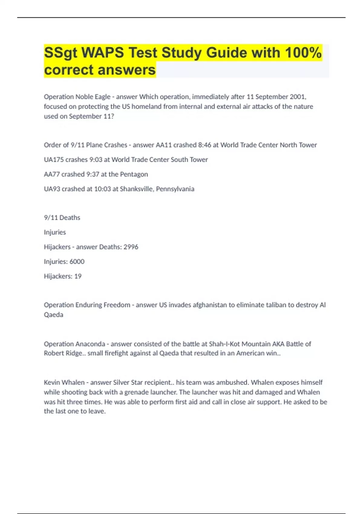 Operation Noble Eagle Which operation, immediately after 11 September 2001, focused on protecting the US homeland from internal and external air attacks of the nature used on September 11? Order of 9/11 Plane Crashes AA11 crashed 8:46 at World Trade Center North Tower UA175 crashes 9:03 at World Trade Center South Tower AA77 crashed 9:37 at the Pentagon UA93 crashed at 10:03 at Shanksville, Pennsylvania 9/11 Deaths Injuries Hijackers Deaths: 2996 Injuries: 6000 Hijackers: 19 Operation Enduring Freedom US invades afghanistan to eliminate taliban to destroy Al Qaeda Operation Anaconda consisted of the battle at Shah-I-Kot Mountain AKA Battle of Robert Ridge.. small firefight against al Qaeda that resulted in an American win.. Kevin Whalen Silver Star recipient.. his team was ambushed. Whalen exposes himself while shooting back with a grenade launcher. The launcher was hit and damaged and Whalen was hit three times. He was able to perform first aid and call in close air support. He asked to be the last one to leave. Operation Freedom's Sentinel After all troops had to be withdrawn from Afghan due to an expiring agreement, a new agreement was made to have 11,000 American troops and 28 NATO nations stay in Afghan and train Afghan Air Force to be fully independent. Jason D. Cunningham Rescue medic/pararescueman on a mission to rescue two American servicemen who were under fire from Al Qaeda and Taliban forces. His helicopter came under fire and was severely damaged. He pulled several bodies from his helicopter and brought them to a more secure location to preform first aid while taking continuous mortar and small arms fire. He was responsible for 10 gravely wounded lives being saved. Ramon Colon-Lopez Pararescueman in the first of four helicopters and took small arms fire. Helicopters had to land and SMSgt Colin-Lopez pressed forward with his team and continued the raid on a drug kingpin funding terrorism. Resulted in two enemies killed, 10 apprehensions, and multiple enemy weapons destroyed. Elizabeth Jacobson Security Forces member guarding a convoy during Operation Iraqi Freedom and her convoy was hit by an IED. She was the first Security Forces Airman and first female Airman to die during Operation Iraqi Freedom. Delorean Sheridan Completing a routine pre-brief with his team for a combat mission when an Afghan Police Officer suddenly opened fire from a truck mounted machine gun from 25 feet away while also the base cane under attack from 15 to 20 insurgents with heavy machine gun fire. He was able to neutralize one of the main shooters and then pull several wounded members to safety. He helped coordinate six medical evacuation helicopters to his location to extract the wounded. He also directed close air combat helicopters to eliminate the enemy. Operation Iraqi Freedom Operation where U.S. troops invaded Iraq and Saddam's forces collapsed almost immediately. Baghdad fell, and Saddam and other Iraqi leaders went into hiding. In the months that followed Saddam and many of his supporters were captured. The approach we took was too use an overwhelming amount of missiles to psychologically mess with the enemy as opposed to physically. 2003. Operation New Dawn New name for Operation Iraqi Freedom. This signifies that everything was under control. And this new start was to "advise, assist, and train the Iraqi Security Forces to combat the terrorists on their own so we could withdraw our troops.