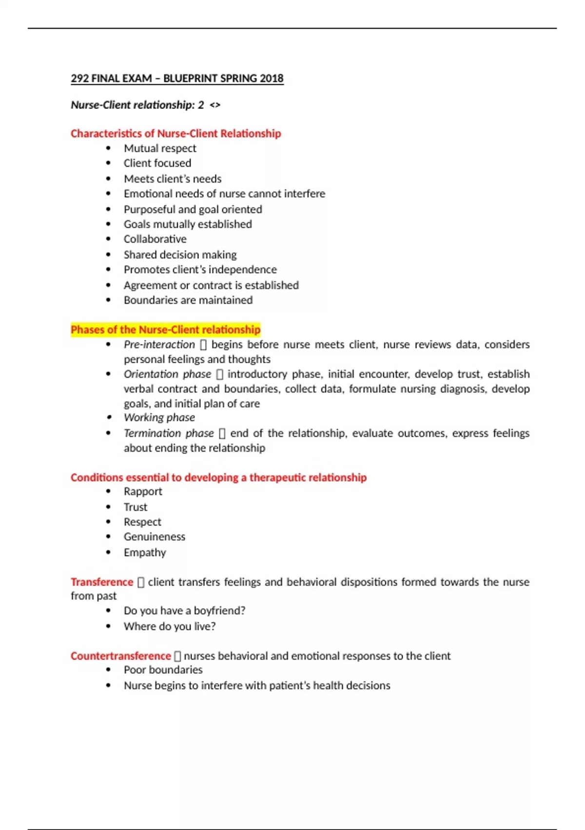 292 FINAL EXAM – BLUEPRINT SPRING 2018 Nurse-Client relationship: 2 <> Characteristics of Nurse-Client Relationship Mutual respect Client focused Meets client’s needs Emotional needs of nurse cannot interfere Purposeful and goal oriented Goals mutually established Collaborative Shared decision making Promotes client’s independence Agreement or contract is established Boundaries are maintained Phases of the Nurse-Client relationship Pre-interaction begins before nurse meets client, nurse reviews data, considers personal feelings and thoughts Orientation phase introductory phase, initial encounter, develop trust, establish verbal contract and boundaries, collect data, formulate nursing diagnosis, develop goals, and initial plan of care Working phase Termination phase end of the relationship, evaluate outcomes, express feelings about ending the relationship Conditions essential to developing a therapeutic relationship Rapport Trust Respect Genuineness Empathy Transference client transfers feelings and behavioral dispositions formed towards the nurse from past Do you have a boyfriend? Where do you live? Countertransference nurses behavioral and emotional responses to the client Poor boundaries Nurse begins to interfere with patient’s health decisions