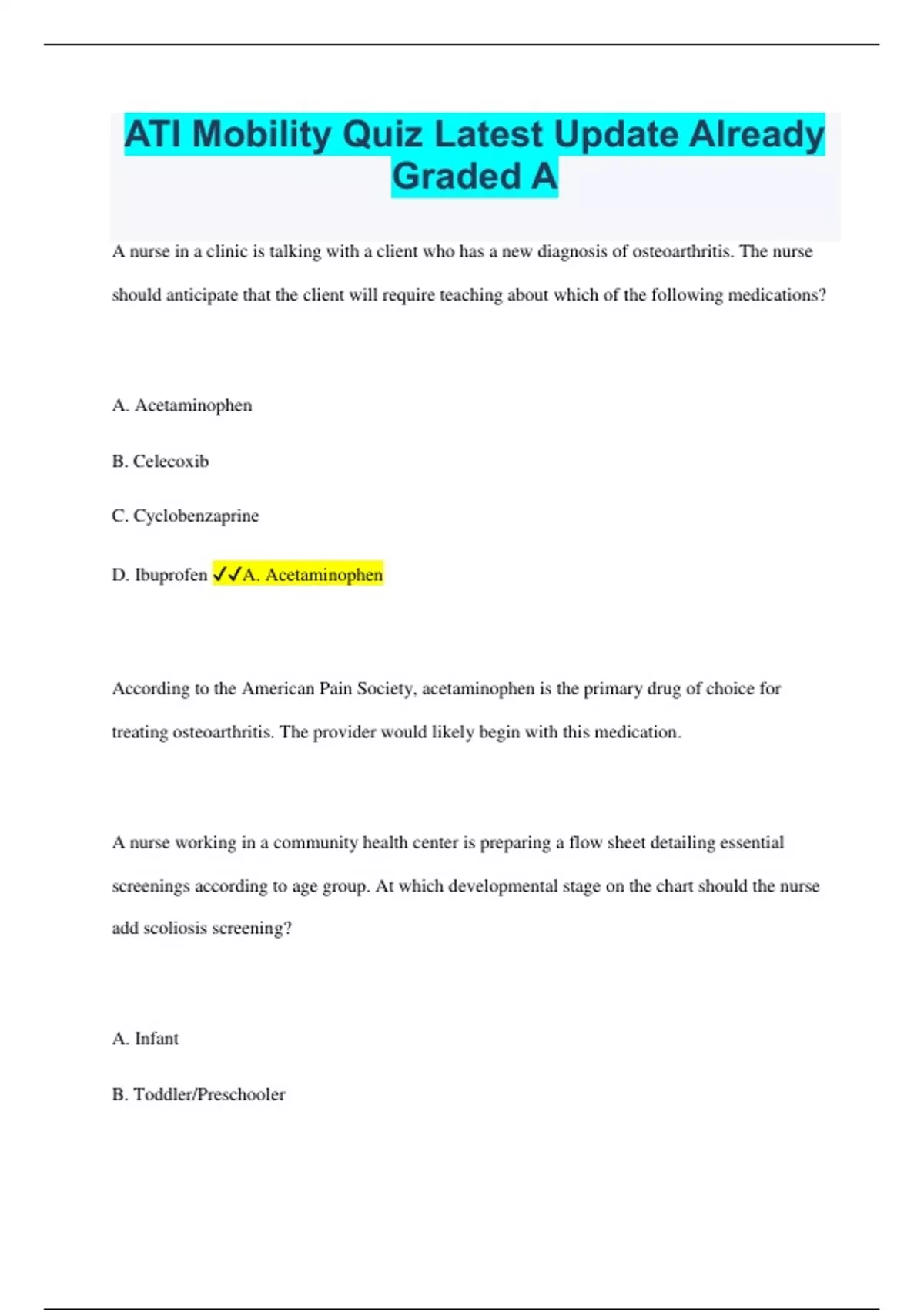 ATI Mobility Quiz Latest Update Already Graded A A nurse in a clinic is talking with a client who has a new diagnosis of osteoarthritis. The nurse should anticipate that the client will require teaching about which of the following medications? A. Acetaminophen B. Celecoxib C. Cyclobenzaprine D. Ibuprofen A. Acetaminophen According to the American Pain Society, acetaminophen is the primary drug of choice for treating osteoarthritis. The provider would likely begin with this medication. A nurse working in a community health center is preparing a flow sheet detailing essential screenings according to age group. At which developmental stage on the chart should the nurse add scoliosis screening? A. Infant B. Toddler/Preschooler C. Pre-adolescent/adolescent D. Older Adult C. Pre-adolescent/adolescent Scoliosis is a condition involving a lateral curvature to the spine. The nurse should include screening for scoliosis during the pre-adolescence/adolescence age group: for girls in grades 5 through 7 and for boys in grade 8 or 9. A nurse is developing a plan of care for a client who has a fracture to achieve the outcome of functional healing. To assist in meeting this goal, which of the following nursing interventions is the highest priority? A. Maintain immobilization and alignment. B. Provide optimal nutrition and hydration C. Promote independence in activities of daily living. D. Provide relief from pain and discomfort. A. Maintain immobilization and alignment. Maintaining the prescribed immobilization and body alignment will keep the fracture fragments in close anatomical proximity, thereby promoting functional fracture healing. According to the safety and risk reduction priority setting framework, this goal should receive the highest priority. A nurse is teaching a client who is starting to take alendronate effervescent tablets to treat osteoporosis. Which of the following information should the nurse include? A. "Sit upright or stand for at least 30 minutes after taking this medication." B. "Take this medication with food." C. "Take this medication with orange juice." D. "Chew or suck on the tablet." A. "Sit upright or stand for at least 30 minutes after taking this medication." The nurse should instruct the client to sit or stand for 30 minutes after administration of this medication to reduce prolonged contact of the medication with the esophageal mucosa that can cause esophagitis. A nurse is caring for a client who has a fractured right femur and is in balanced suspension traction. The client is reporting pain from muscle spasms. Which of the following actions should the nurse take first? A. Administer an opioid analgesic. B. Obtain a prescription to adjust the weight amount. C. Offer a muscle relaxant to the client. D. Realign the client's position. D. Realign the client's position. The greatest risk to this client is injury form circulatory compromise and tissue damage; therefore, the first action the nurse should take is to realign the client's position. A nurse is reviewing risk factors for osteoporosis with a group of nursing students. The nurse should include that which of the following types of medication therapy is a risk factor for osteoporosis? A. Thyroid hormones B. Anticoagulants C. NSAIDs D. Cardiac glycosides A. Thyroid hormones Long-term use of a synthetic thyroid hormone, such as levothyroxine, can accelerate bone loss. A nurse is teaching an older adult client who has an intracapsular fracture of the right hip following a fall about the purpose of Buck's extension traction. The nurse should include which of the following information in the teaching? A. Buck's extension traction will reduce the fracture. B. Buck's extension traction will relieve muscle spasms. C. Buck's extension traction will maintain alignment of the pins. D. Buck's extension traction will allow supported movement of the