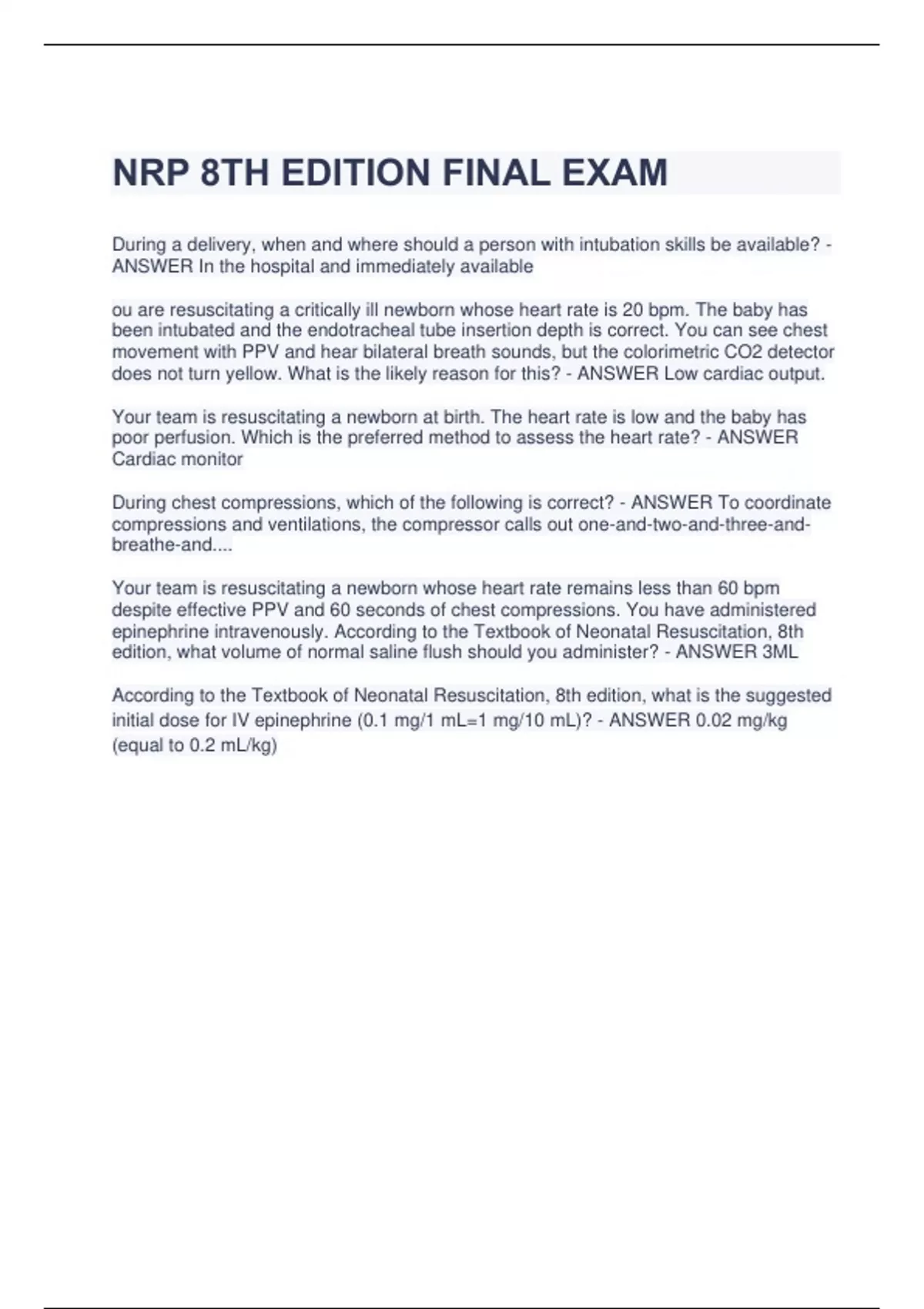 NRP 8th Edition Quiz Answers Part-1 Preassessment When is the placement of endotracheal tube recommended? A- HR<100 Intubation skills be available? A- In hospital and immediately available Confirming endotracheal tube C- exhaled Co2 and inc HR Co2 detector not yellow D- Low cardiac output 8th edition cardiac monitor recommended B- When alternative airway is inserted Laryngoscope blade sizes D- single 0 not 00 HR during chest compression C- 60 sec and use cardiac monitor HR low and poor perfusion A-cardiac monitor Chest compression indicated? B- HR<60 after 30 sec PPV HR 70 bpm after PPV A- Stop chest compression and continue PPV Depth of chest compressions A- 1/3rd AP dia of chest chest compressions D- 1-2-3 and breathe Saline Flush C- 3ml 8th annual NPR - Epi A- 0.02 mg/kg Volume expanders A- Hr not inc and sign of shock and hx of acute blood loss 10ml/kg saline B- 5 to 10 min After IV check HR after C- 60 sec Conc of O2 for PPV A- 21-30