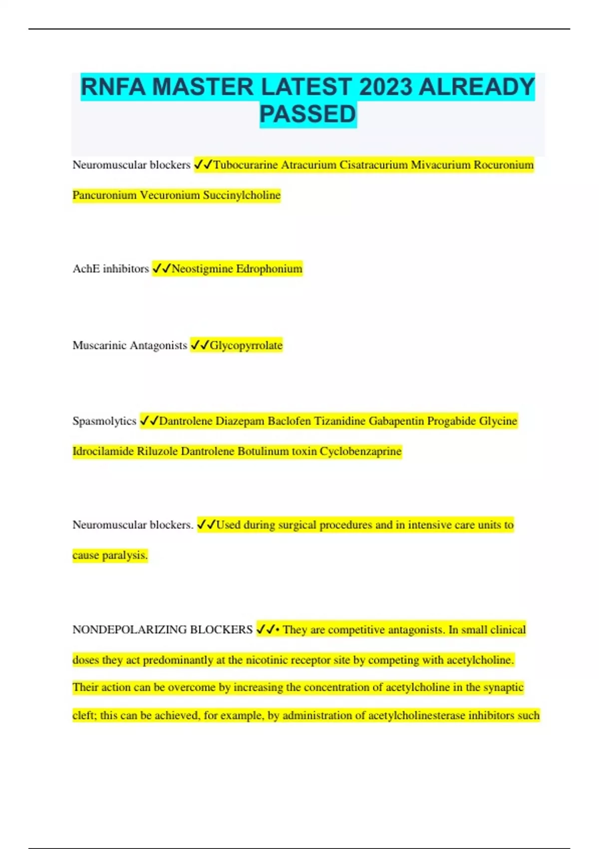 RNFA MASTER LATEST 2023 ALREADY PASSED Neuromuscular blockers Tubocurarine Atracurium Cisatracurium Mivacurium Rocuronium Pancuronium Vecuronium Succinylcholine AchE inhibitors Neostigmine Edrophonium Muscarinic Antagonists Glycopyrrolate Spasmolytics Dantrolene Diazepam Baclofen Tizanidine Gabapentin Progabide Glycine Idrocilamide Riluzole Dantrolene Botulinum toxin Cyclobenzaprine Neuromuscular blockers. Used during surgical procedures and in intensive care units to cause paralysis. NONDEPOLARIZING BLOCKERS • They are competitive antagonists. In small clinical doses they act predominantly at the nicotinic receptor site by competing with acetylcholine. Their action can be overcome by increasing the concentration of acetylcholine in the synaptic cleft; this can be achieved, for example, by administration of acetylcholinesterase inhibitors such as neostigmine or edrophonium. Anaesthesiologists use this strategy to shorten the duration of the neuromuscular blockade. • In larger doses, nondepolarizing blockers also enter the pore of the ion channel to cause a more intense motor blockade. This further weakens neuromuscular transmission and diminishes the ability of acetylcholinesterase inhibitors to antagonize the action of nondepolarizing blockers. • Nondepolarizing blockers may also block prejunctional sodium channels. As a result, they reduce the release of acetylcholine at the nerve ending. • During anesthesia, the IV administration of a nondepolarizing blocker first causes motor weakness; ultimately, skeletal muscles become totally flaccid and inexcitable to stimulation. Larger muscles (e.g. those of the trunk) are more resistant to block and recover more rapidly than smaller ones (e.g. muscles of the hand). DEPOLARIZING BLOCKERS Succinylcholine is the only depolarizing neuromuscular blocker used clinically in the USA. succinylcholine remains popular because it is the only ultrarapid onset/ultrashort duration neuromuscular blocker available. • Succinylcholine binds to the nicotinic receptor and acts like acetylcholine to cause depolarization of the end plate. This in turn spreads and depolarizes adjacent membranes, causing transient fasciculations, especially in chest and abdomen, though general anesthesia and prior administration of a small dose of a nondepolarizing muscle relaxant tends to attenuate them. Succinylcholine is not metabolized effectively at the synapse, therefore the membrane remains depolarized and unresponsive to additional impulses. A flaccid paralysis results. This is called Phase I block, or depolarization block. Phase I block is augmented, not reversed, by acetylcholinesterase inhibitors. • The onset of neuromuscular blockade is very rapid, usually within 1 minute. Because of its rapid hydrolysis by plasma butyrylcholinesterase (pseudocholinesterase), duration of neuromuscular block is 5-10 minutes. • With a single large dose, repeated doses, or prolonged continued infusion of succinylcholine (30-60 minutes) the membrane repolarizes; despite this repolarization, the membrane can't be depolarized again because it is desensitized. The channels behave as if they are in a prolonged closed state. This is